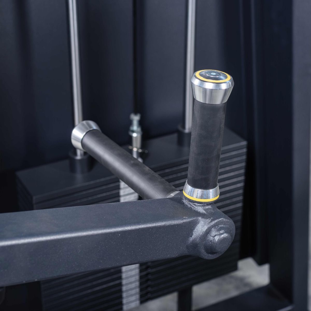 Тренажёр оснащён рукоятями для двух вариантов хвата: вертикального и горизонтального, что позволяет варьировать акцент нагрузки на разные участки мышц спины.