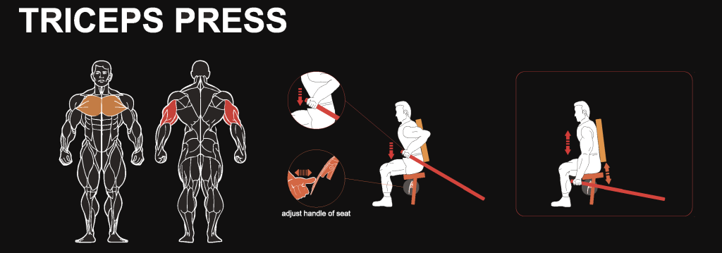 Конструкция тренажера надежно фиксирует плечевой пояс и корпус, полностью исключая читинг и участие других мышечных групп. Это позволяет концентрировать нагрузку исключительно на трицепсе, обеспечивая его качественную проработку по всей длине — от полного растяжения до пикового сокращения.