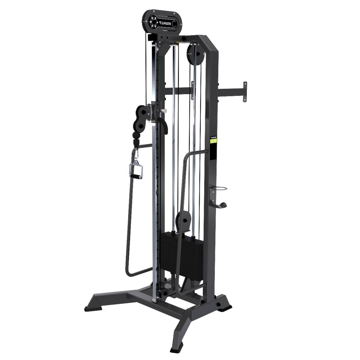 Тренажёр оснащён вертикальной металлической направляющей, по которой перемещается рабочий узел с рукоятью, обеспечивая регулировку его положения по высоте.