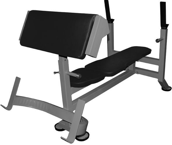 Конструкция также применяется для укрепления грудных мышц. При их тренировке спортсмен ложится на опорную поверхность, снимает снаряд со стоек и начинает подход. Скамья Скотта со штангой имеет мощные страховочные упоры, которые регулируются по высоте в диапазоне от 550 до 750 мм. Они предотвращают падение отягощения на грудь атлета в процессе жима. Ширина регулируемых выдвижных стоек подобрана так, чтобы на них удобно разместились штанги и грифы для пауэрлифтинга. Кроме того, возможно использование олимпийских, Z- и W-образных снарядов.