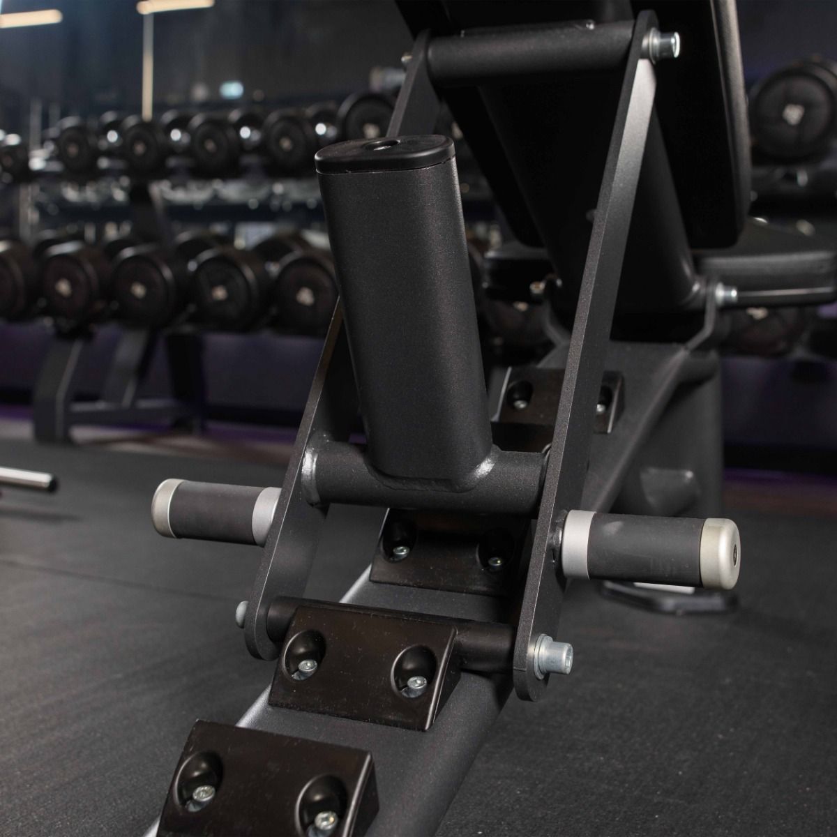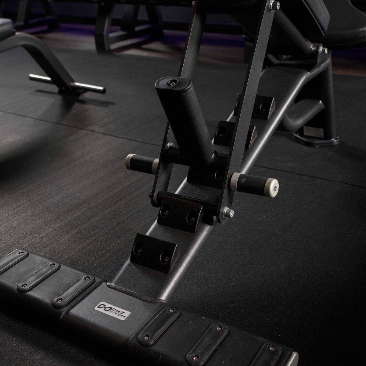 На раме тренажера закреплены резиново-пластиковые упоры для ног для устойчивого положения спортсмена во время выполнения упражнения и защиты основания скамья от механических повреждений.