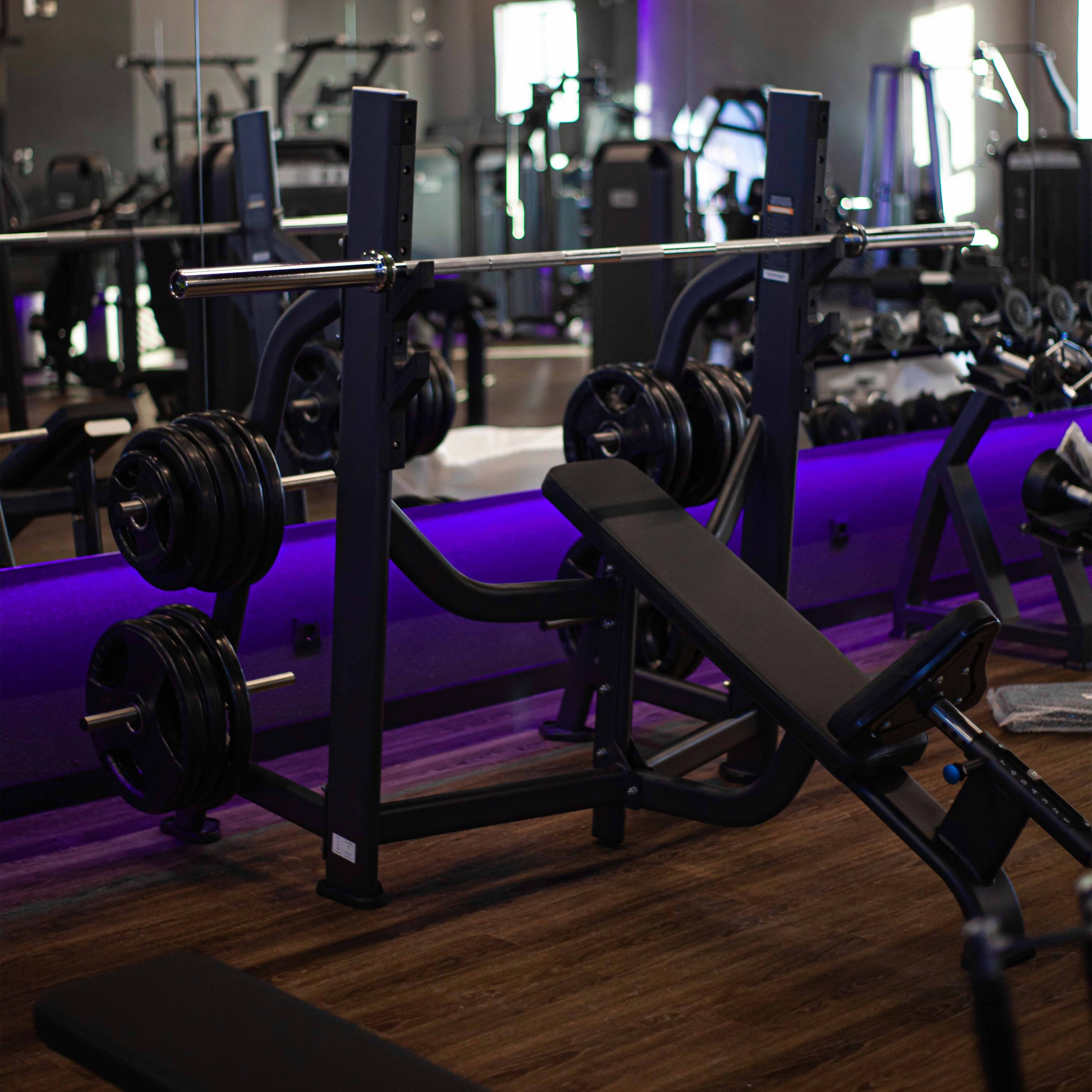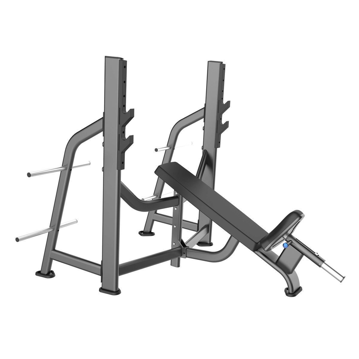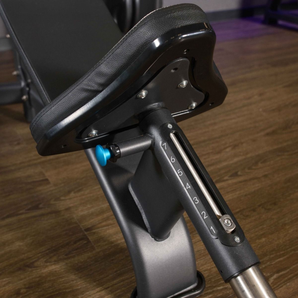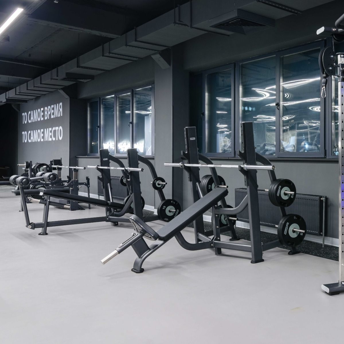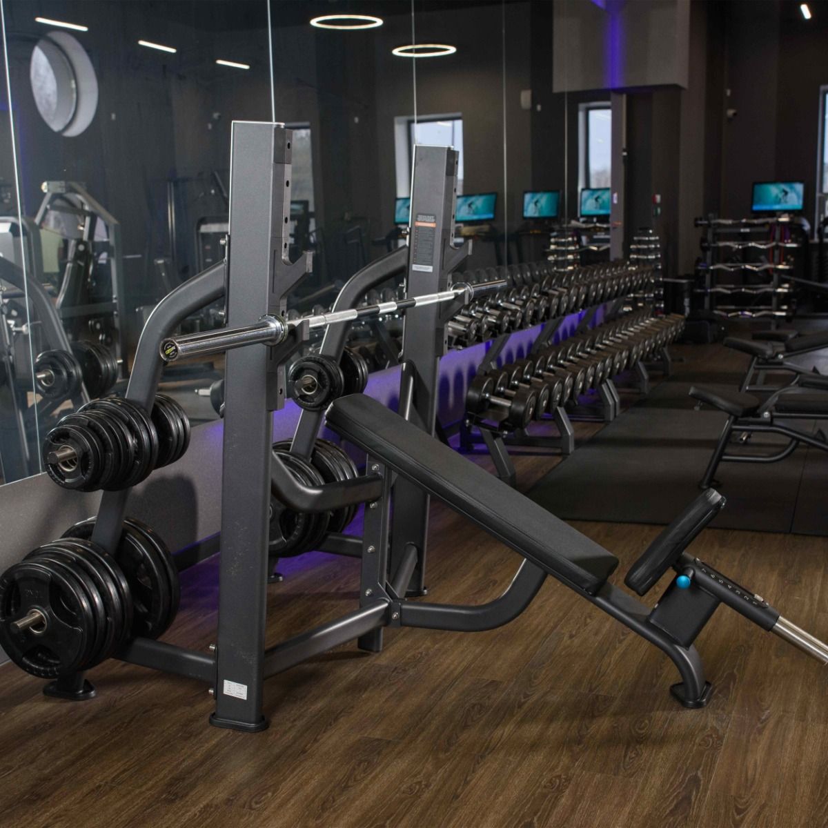 На раме закреплено восемь металлических накопителей для хранения свободных весов, оборудованных кольцами из плотной резины для предотвращения механических повреждений при соприкосновении дисков с рамой.