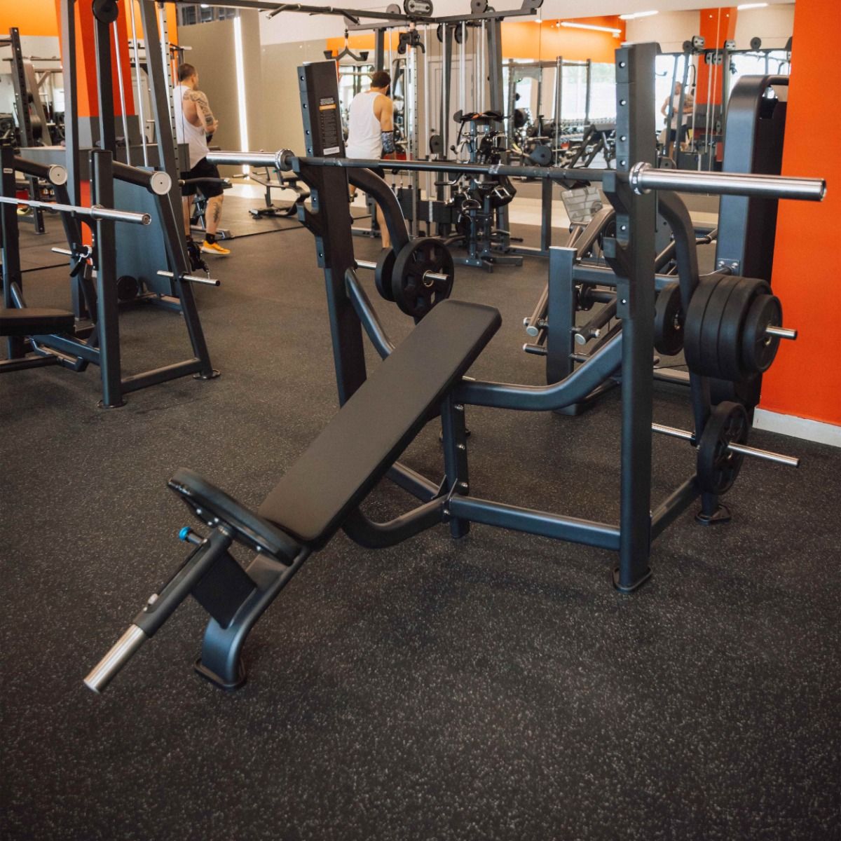 На раме тренажера закреплены двухуровневые упоры из пластика с четырьмя ложементами для фиксации штанги и предотвращения механического воздействия на раму и покрытие.