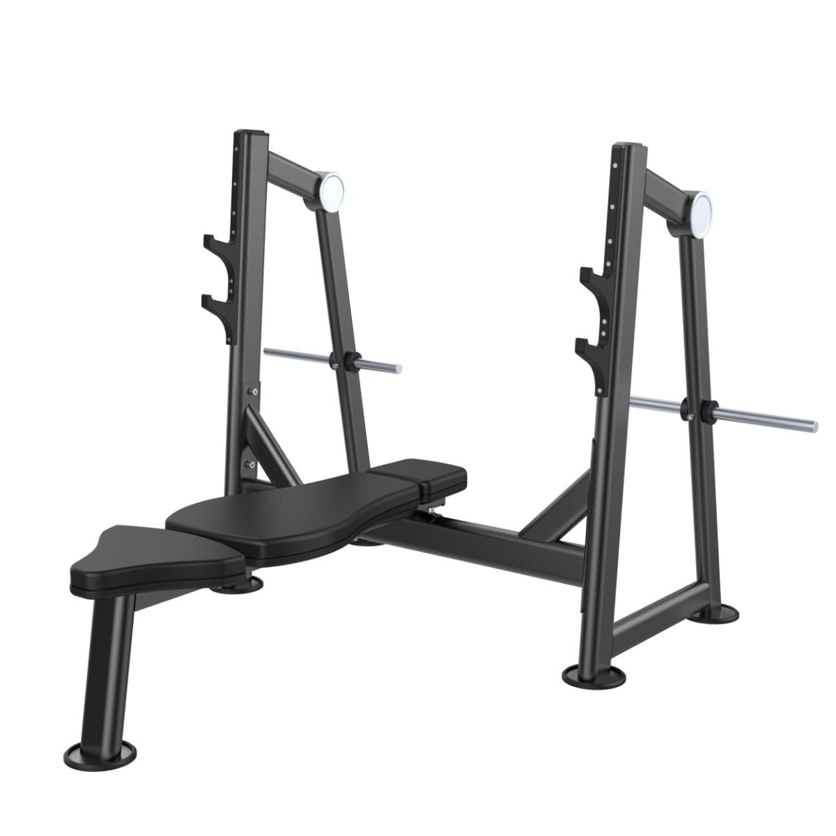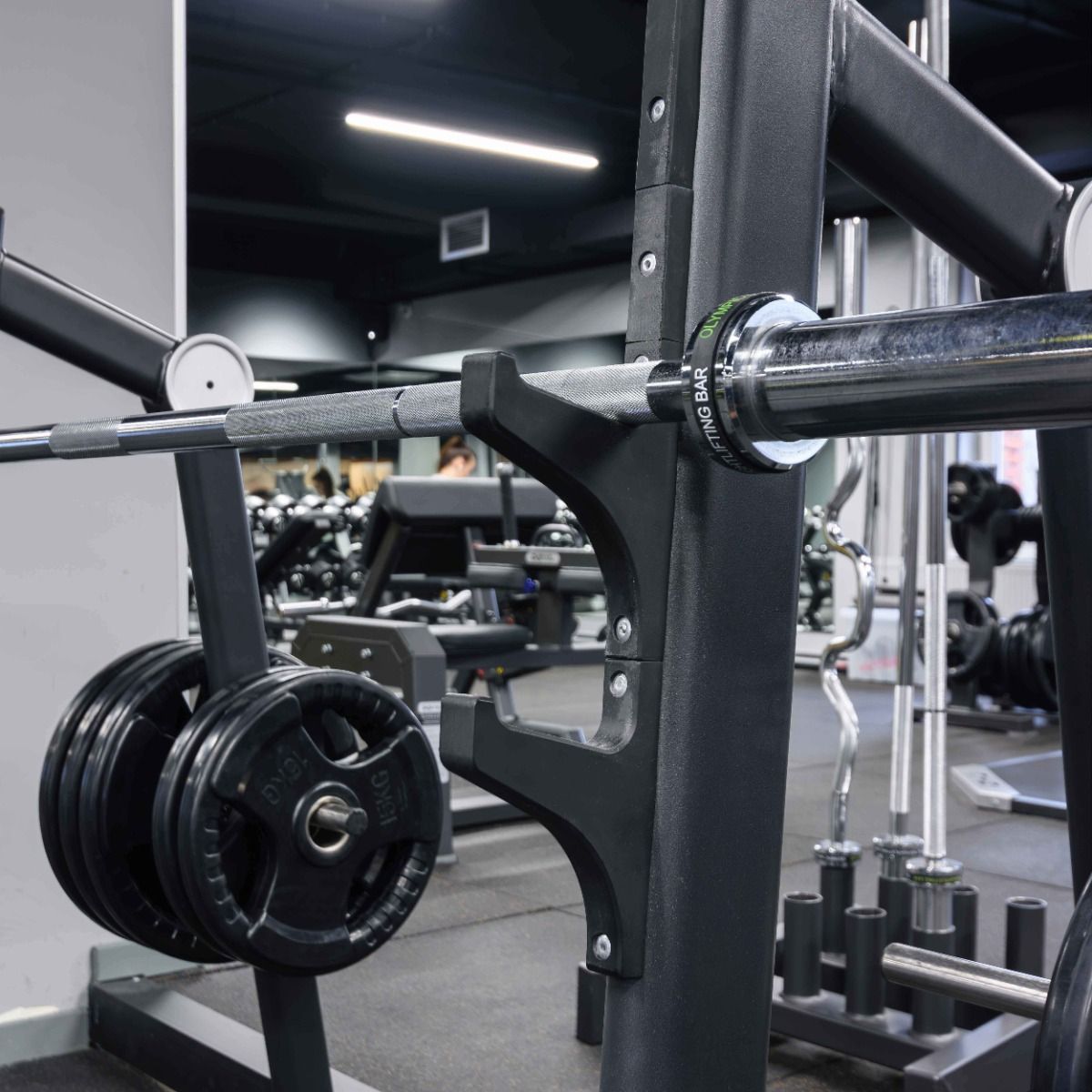 На раме тренажера закреплены двухуровневые опоры из пластика с четырьмя ложементами для фиксации штанги и предотвращения механического воздействия на раму и покрытие.