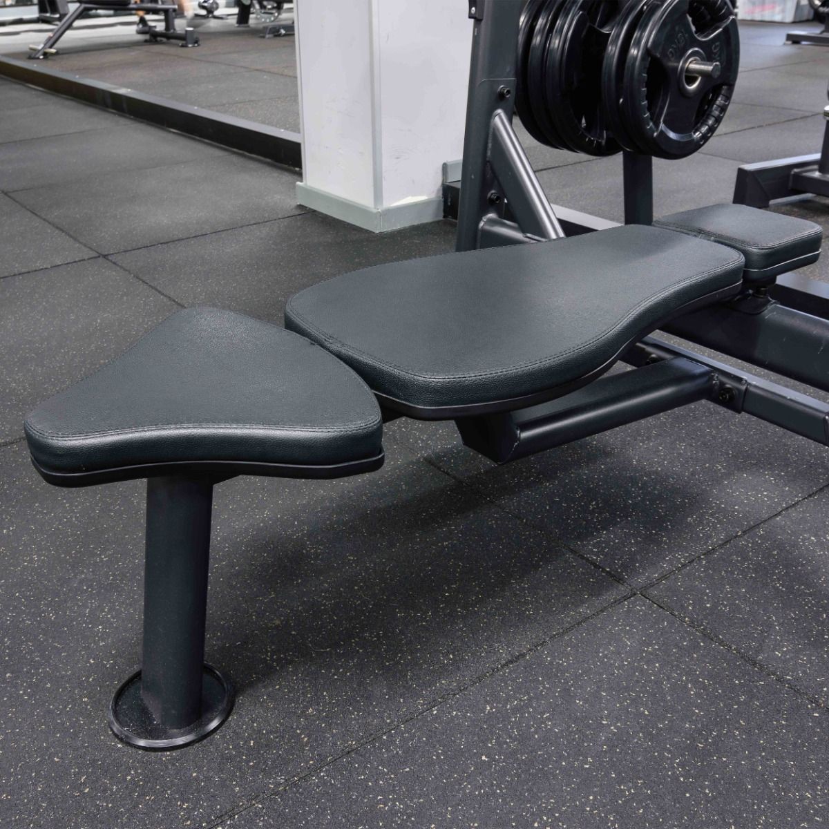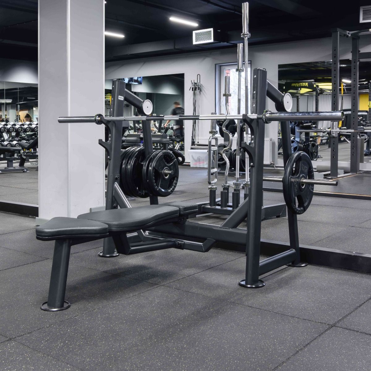 На раме закреплены четыре металлических накопителя для хранения свободных весов, оборудованные кольцами из плотной резины для предотвращения механических повреждений при соприкосновении дисков с рамой.