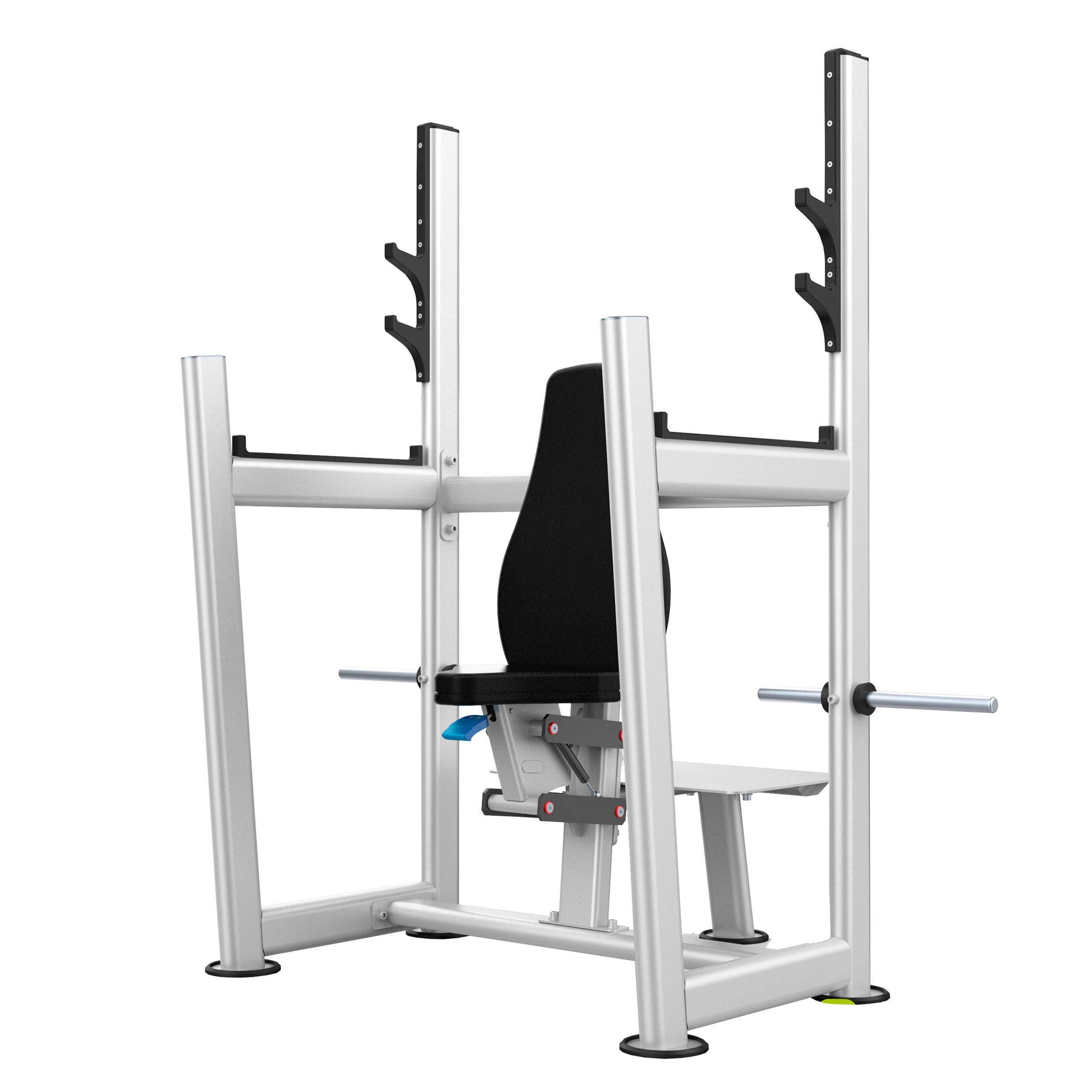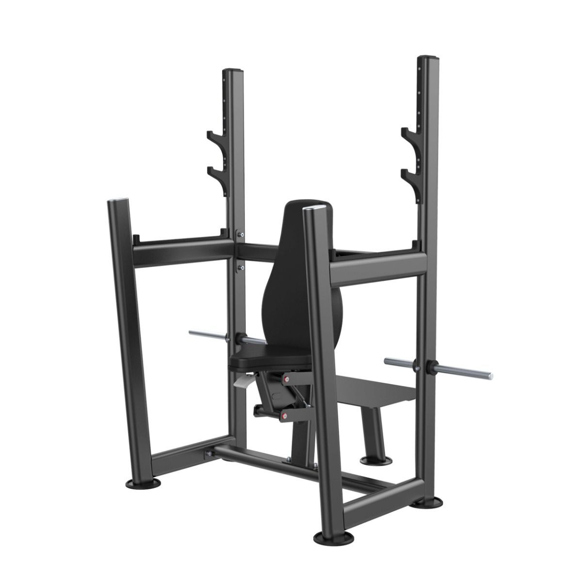 На раме тренажера закреплены двухуровневые опоры из пластика с четырьмя ложементами для фиксации штанги и предотвращения механического воздействия на раму и покрытие.