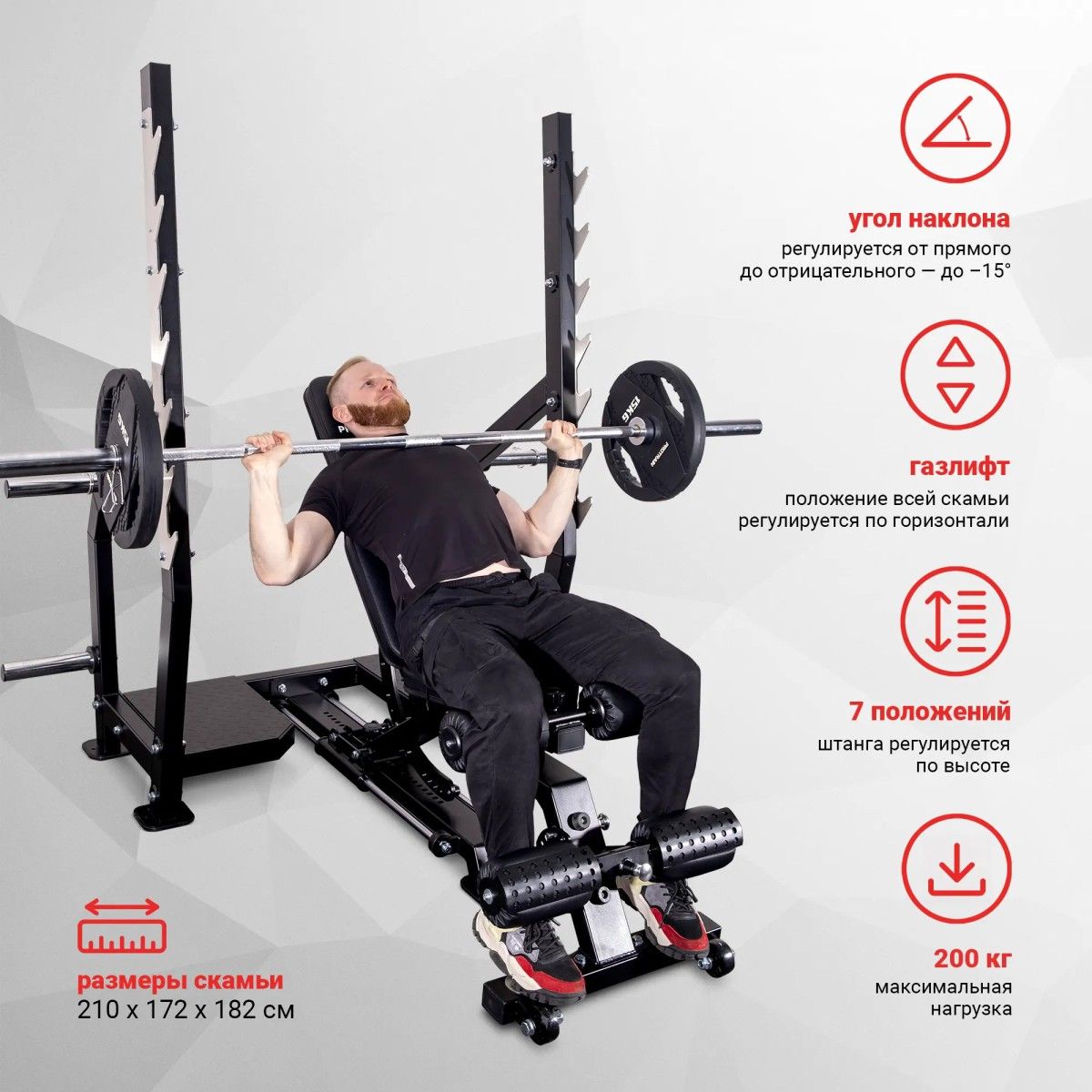 Скамья Protrain PR-PRORACK представляет собой профессиональное оборудование бизнес-класса, разработанное для выполнения широкого спектра жимовых упражнений. Ее габаритные размеры (210×172×182 см) и продуманная конструкция обеспечивают комфорт и безопасность при работе с максимальными весами.