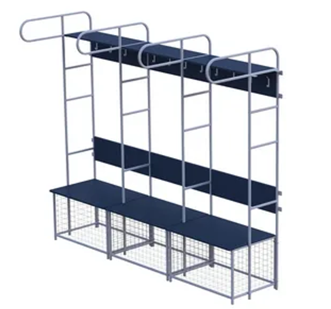В ящике, крышка которого служит игроку сидением, уместится хоккейный баул. На гардеробных крючках можно разместить одежду, а на верхних полках - хоккейные и личные аксессуары.