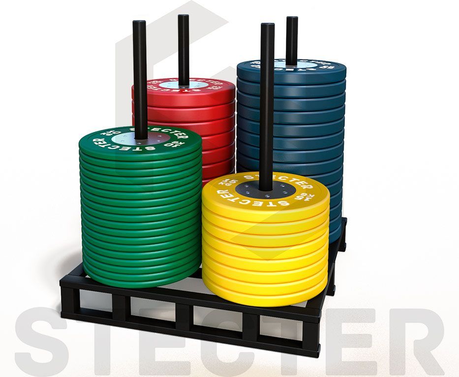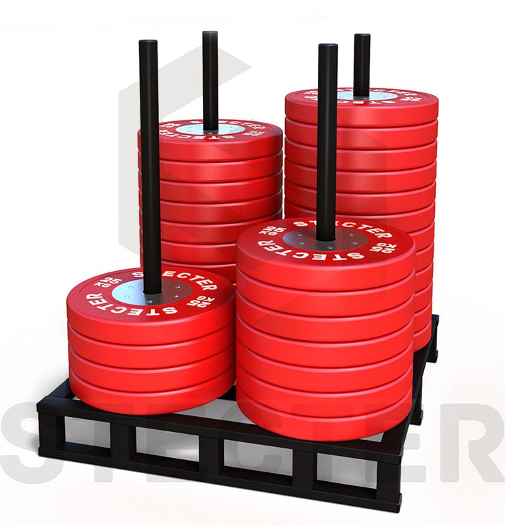 Универсальный поддон для хранения и транспортировки дисков штанги будет полезен при организации спортивных соревнований. Рассчитан для дисков штанги внешним диаметром 450 мм с посадочным отверстием 50 мм. Платформа поддона цельносварная и рассчитана на грузоподъемность 1200 кг. Съемные втулки для дисков позволяют использовать поддон для транспортировки других грузов (на поверхности поддона остаются только 4 стакана высотой 60 мм). Вся поверхность окрашена порошковой краской.