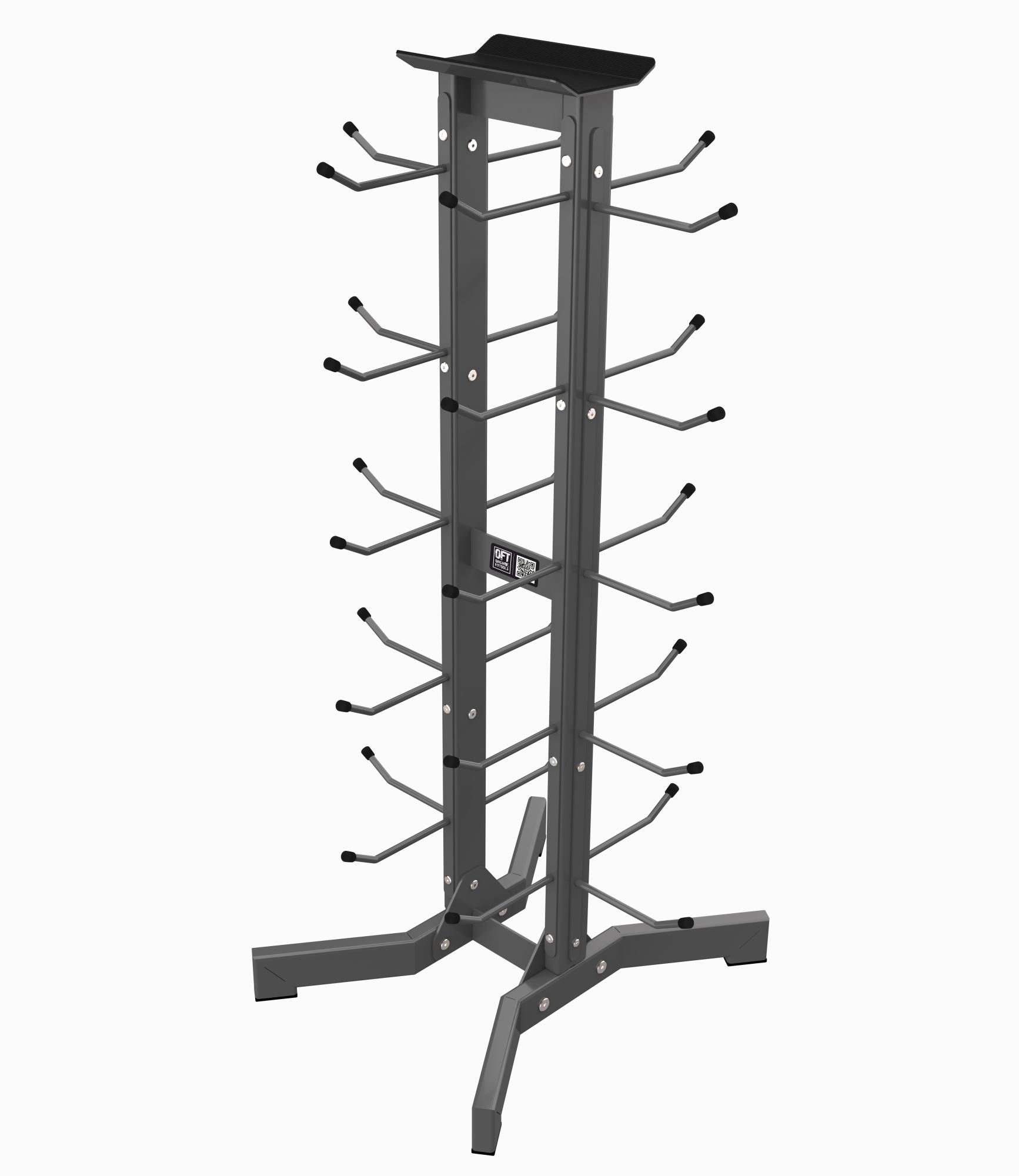 Стойка для хранения рукояток и тяг напольная Original FitTools FT-ACRK-HV - это подставка, позволяющая компактно складировать имеющиеся в тренажерном зале рукоятки от тренажеров, ремни и ремешки, манжеты для ног, эспандеры, замки для грифов, накладки и утяжелители.
