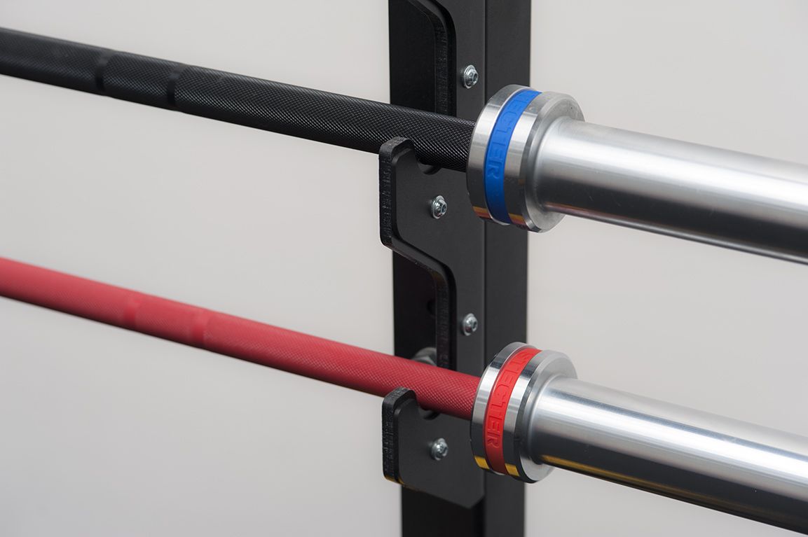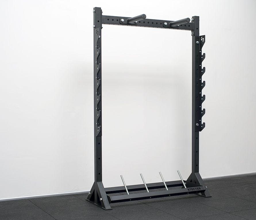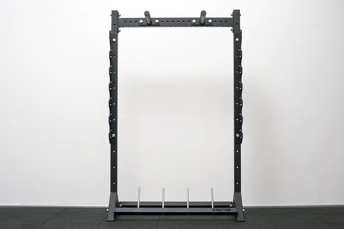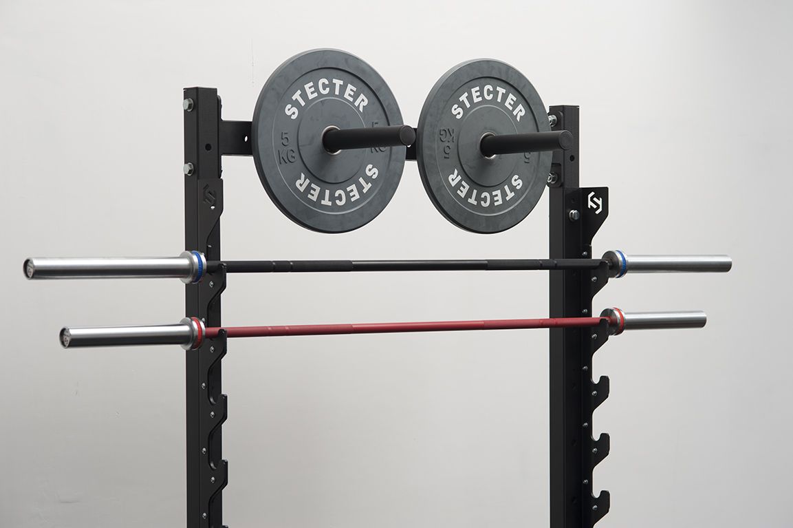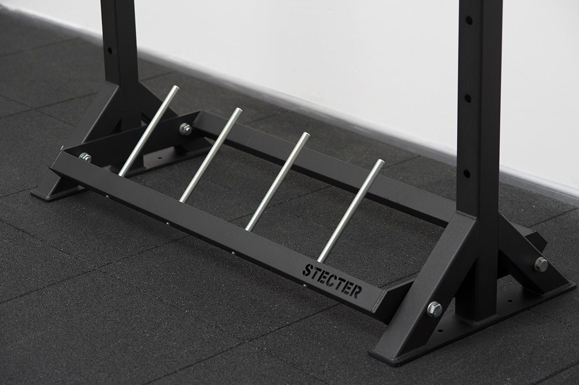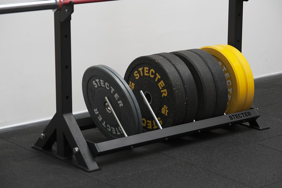 Удобство хранения дисков. В последнее время появилось много разновидностей дисков для штанги: каучуковые блины, соревновательные диски, бамперные (HI-TEMP) блины. Все они имеют различную толщину и не совсем удобно их хранить в отсеках с фиксированной шириной. Компания STECTER предлагает уникальную конструкцию полки. Она имеет специальную перфорацию. В данные отверстия устанавливаются специальные разделительные прутки. Вы можете их переставлять и сами выбирать оптимальную ширину отсеков для каждого вида дисков, либо совсем убрать и использовать полку без разделения на отсеки.
