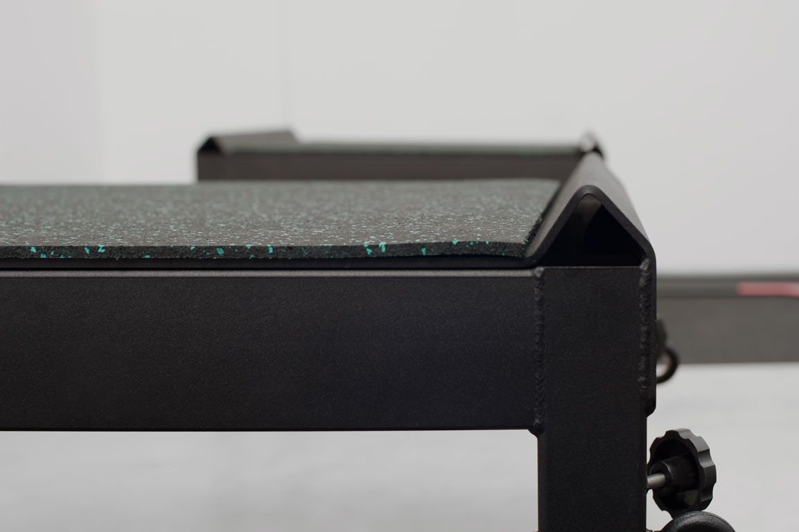 Сверху на каркас установлен стальной настил толщиной 5 мм. Данный настил обладает специальными бортами, которые препятствуют «скатыванию» штанги с рабочей поверхности. Так же в комплекте поставляется резиновый коврик, который укладывается на настил. Он смягчает удары от падающей штанги и продлевает срок её службы, а так же уменьшает грохот во время тренировки.