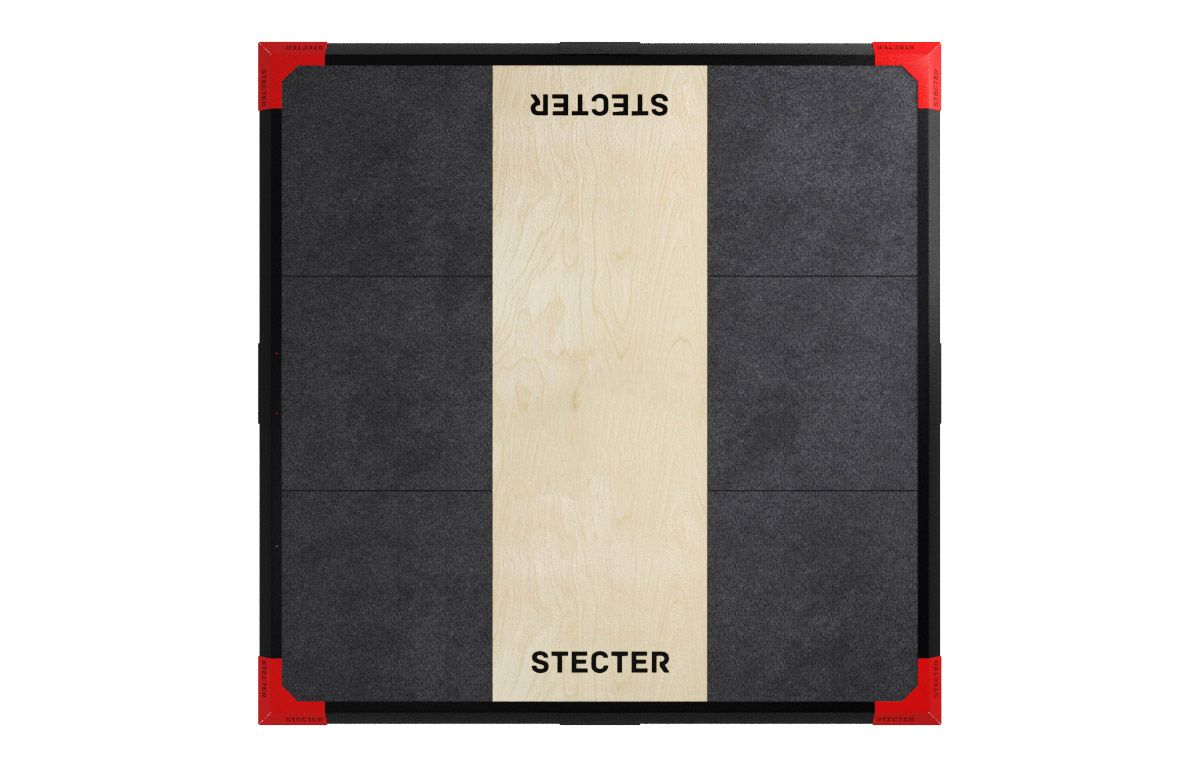 Каждая плитка для помоста имеет размер 1х1 метр и изготавливается из переработанной резиновой крошки. Смесь крошки и высокопрочного клея сжимается под прессом до толщины в 40 мм и спекается в печи. В результате получается очень прочная пластина с превосходными амортизирующими свойствами, способная гасить удары падающей на помост штанги.