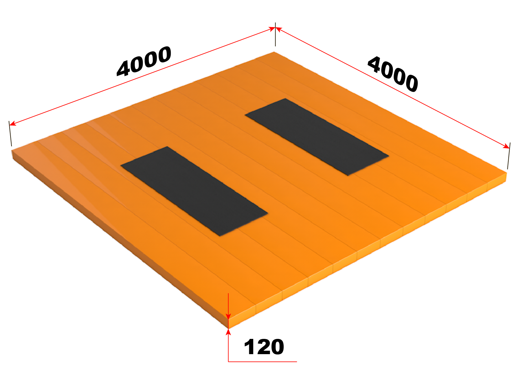 Квадратная сборная платформа, состоящая из 12-ти деревянных секций одинаковых по размеру, но разных по конструкции. Они крепятся друг к другу и стянуты шпильками. В 6-ти центральных секциях врезаны 2 амортизационные дорожки. Размеры резиновых амортизаторов согласовываются с заказчиком и могут быть различными.