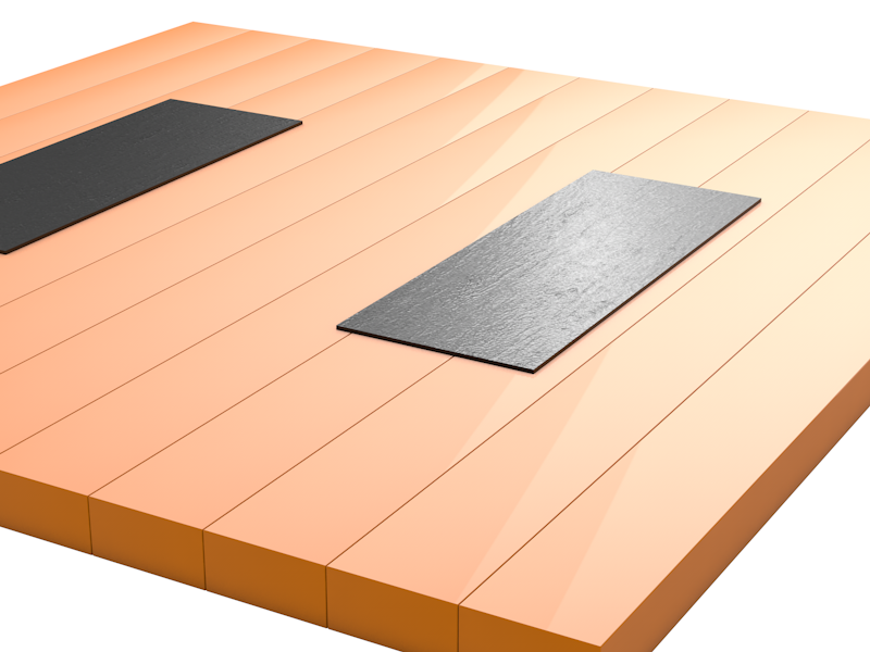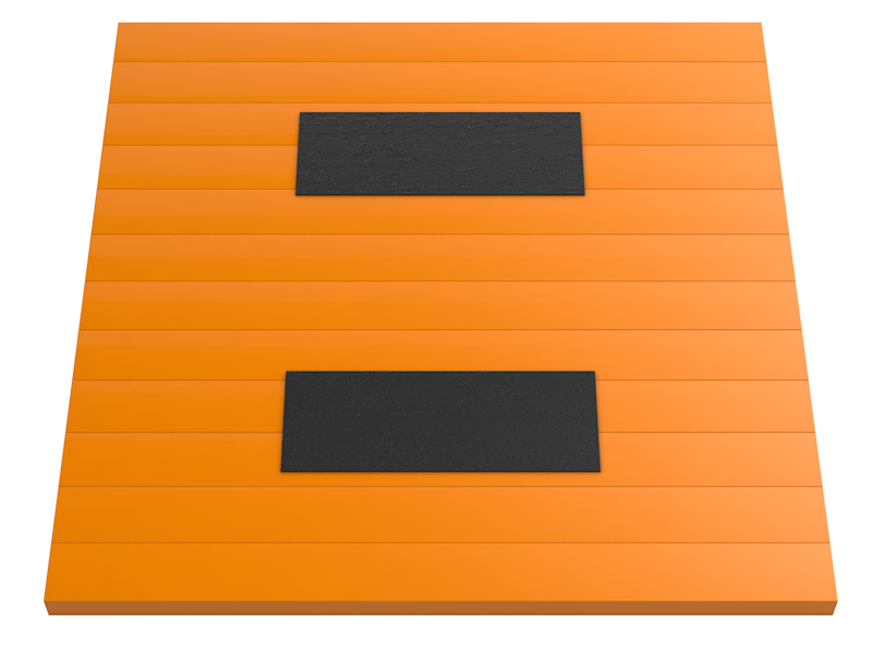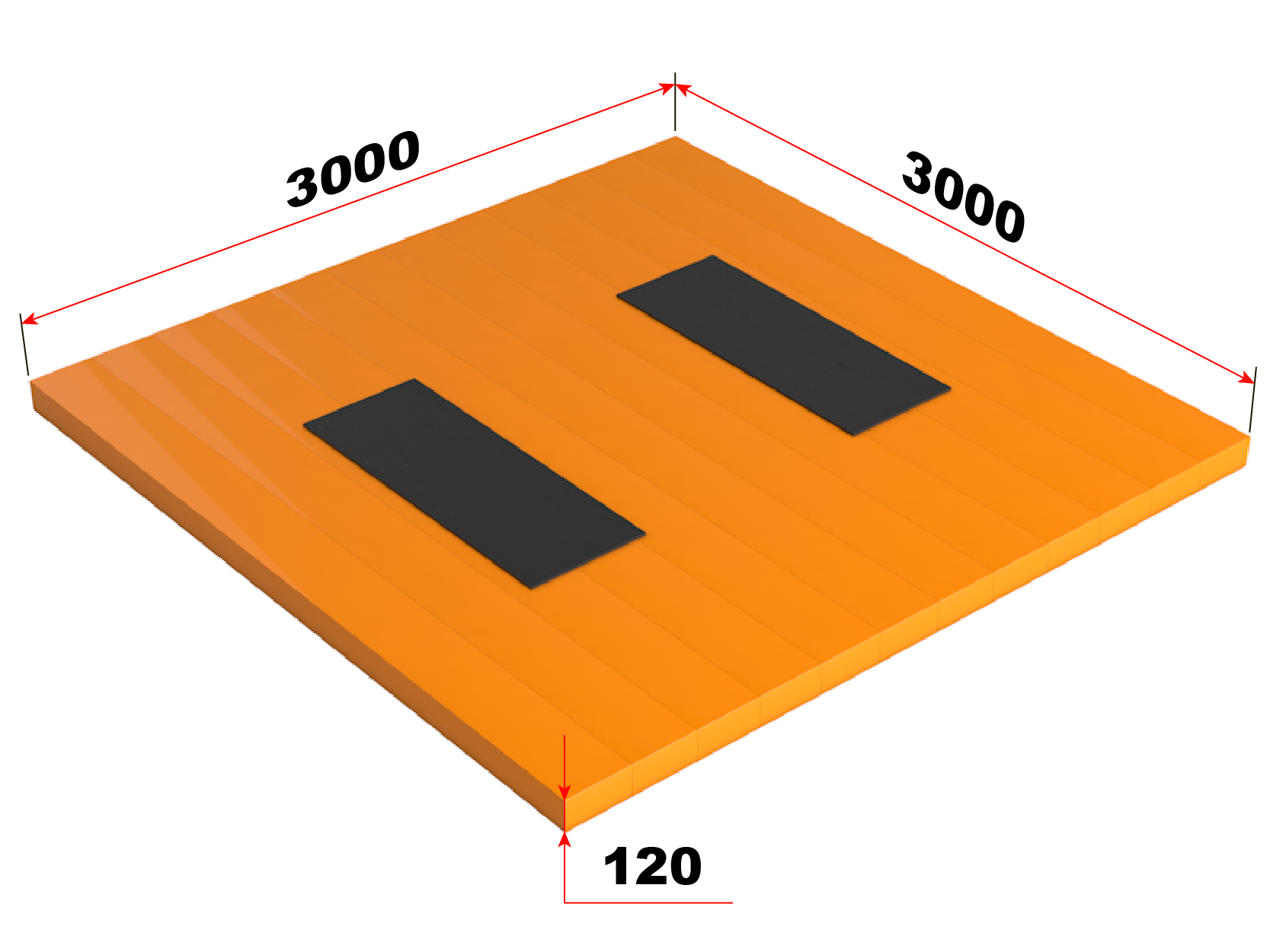 Квадратная сборная платформа, состоящая из 12-ти деревянных секций одинаковых по размеру, но разных по конструкции. Они крепятся друг к другу и стянуты специальными металлическими шпильками. В 6-ти центральных секций врезаны 2 амортизационные дорожки. Размеры резиновых амортизаторов согласовываются с заказчиком и могут быть различными.