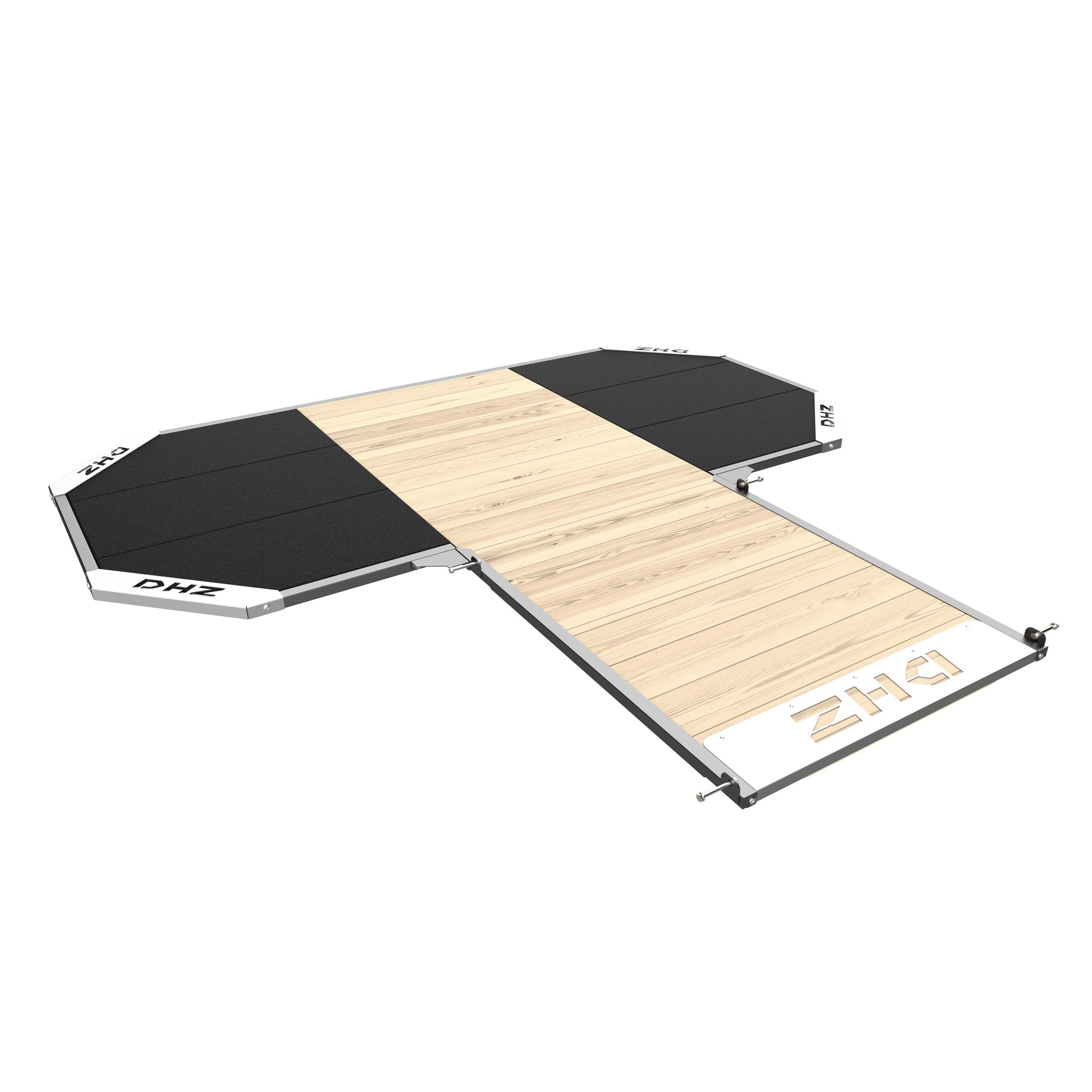 Помост представляет собой раму из металлического профиля 40х40х2 с декоративными угловыми накладками из листового металла толщиной 3мм, резиновых мат и деревянного настила. Помост оснащен амортизирующими резиновыми матами толщиной 40 мм в количестве 6 штук, повышающей износостойкость вашего оборудования и поглощающие звук при ударе штанги о пол. В сочетание с резиновыми матами в зоне перемещения атлета используется деревянный настил из паркетной доски и фанеры, под которую укладывается подложка листовая, для выравнивания поверхности пола и амортизации деревянного настила.