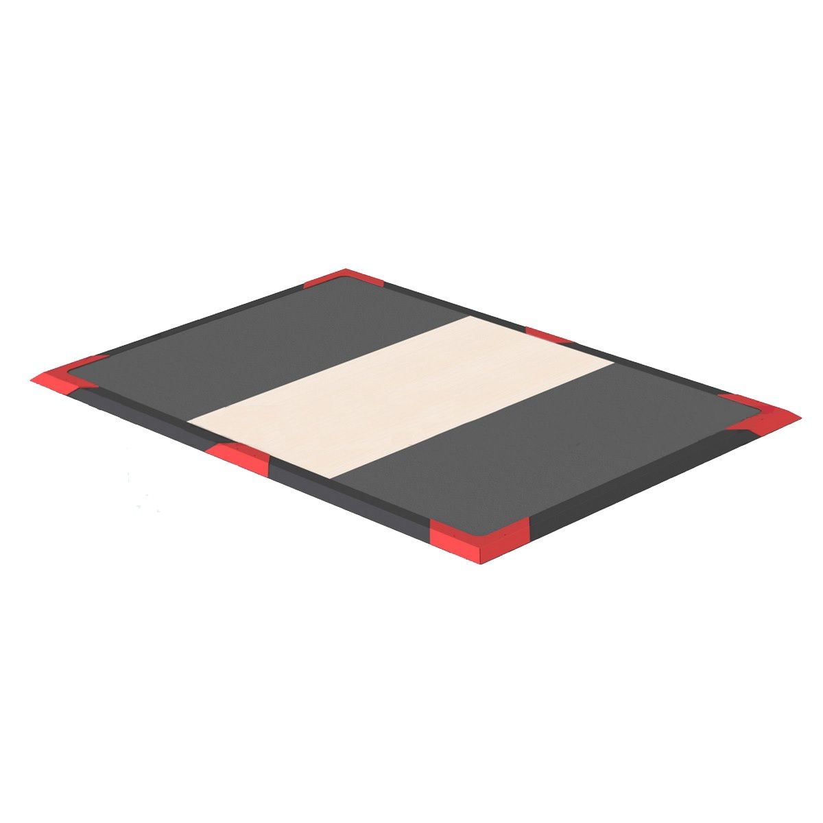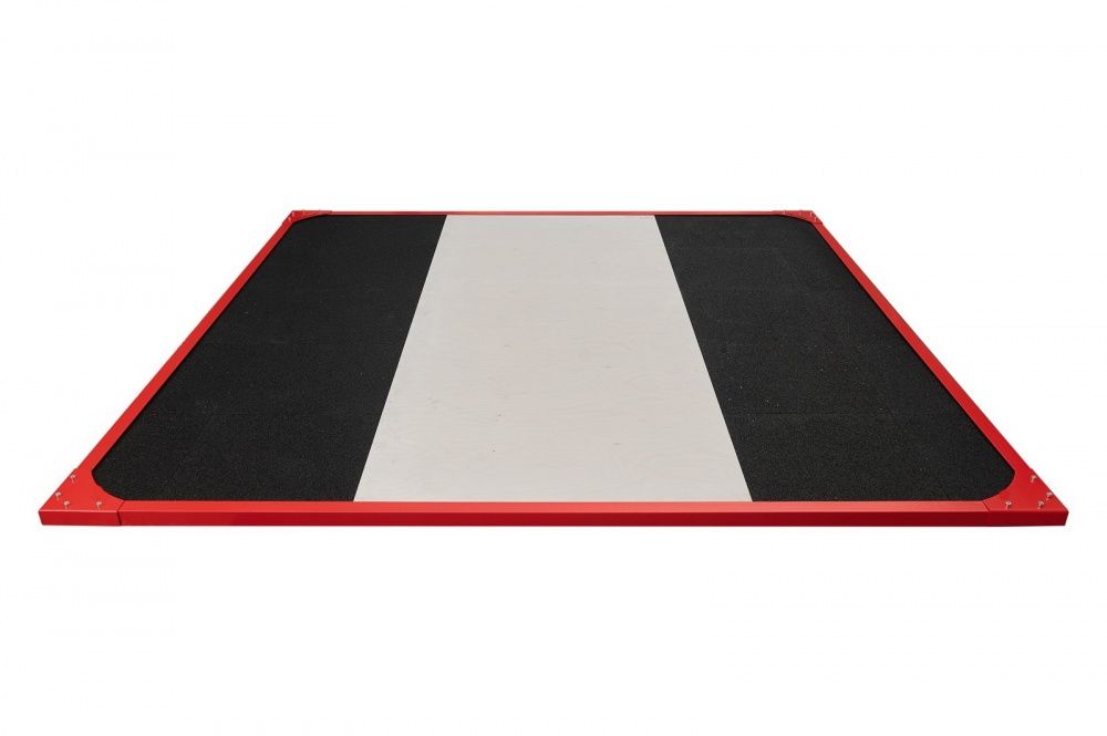 Платформа помоста выполнена из высококачественной сдвоенной фанерной доски, что обеспечивает устойчивость и исключает риск скольжения, а дорожки из резиновой крошки амортизируют падение штанги.