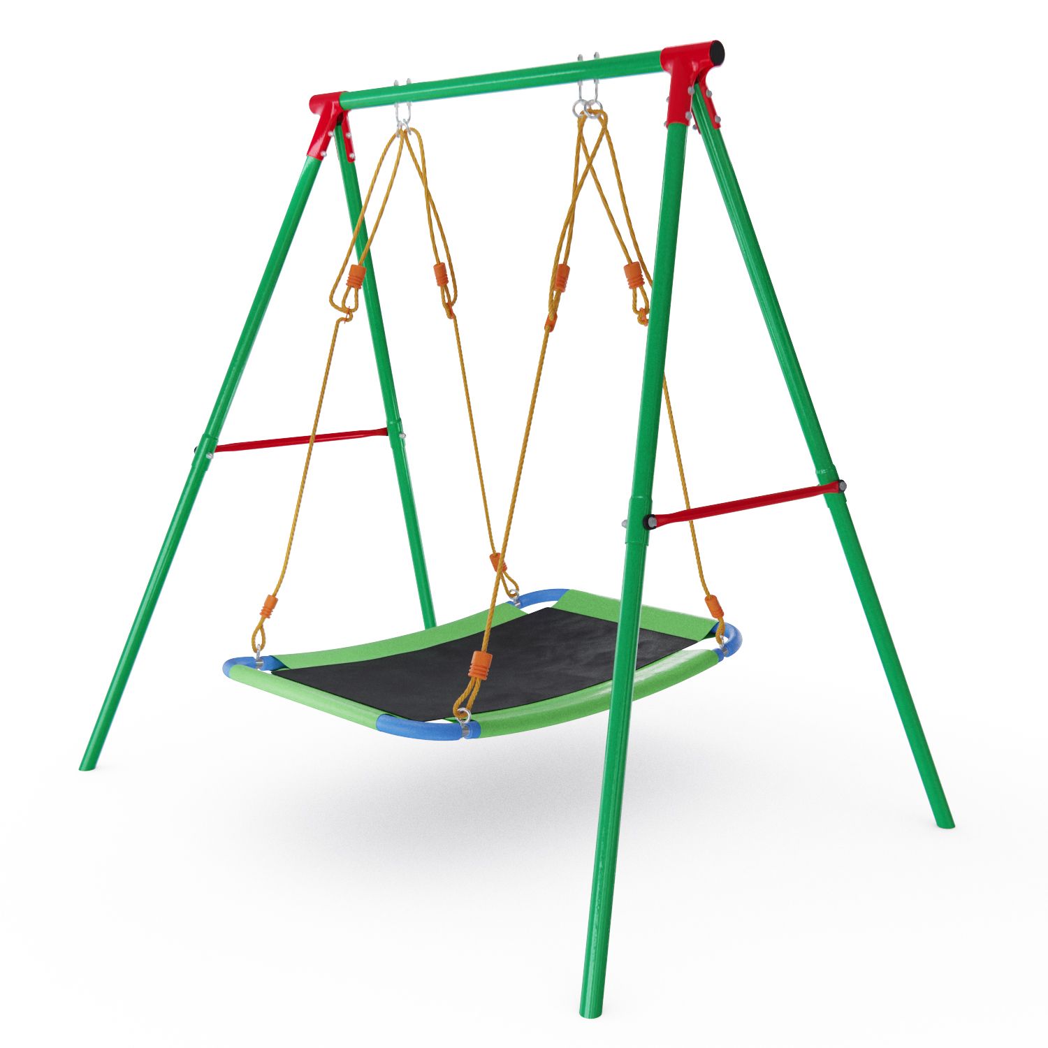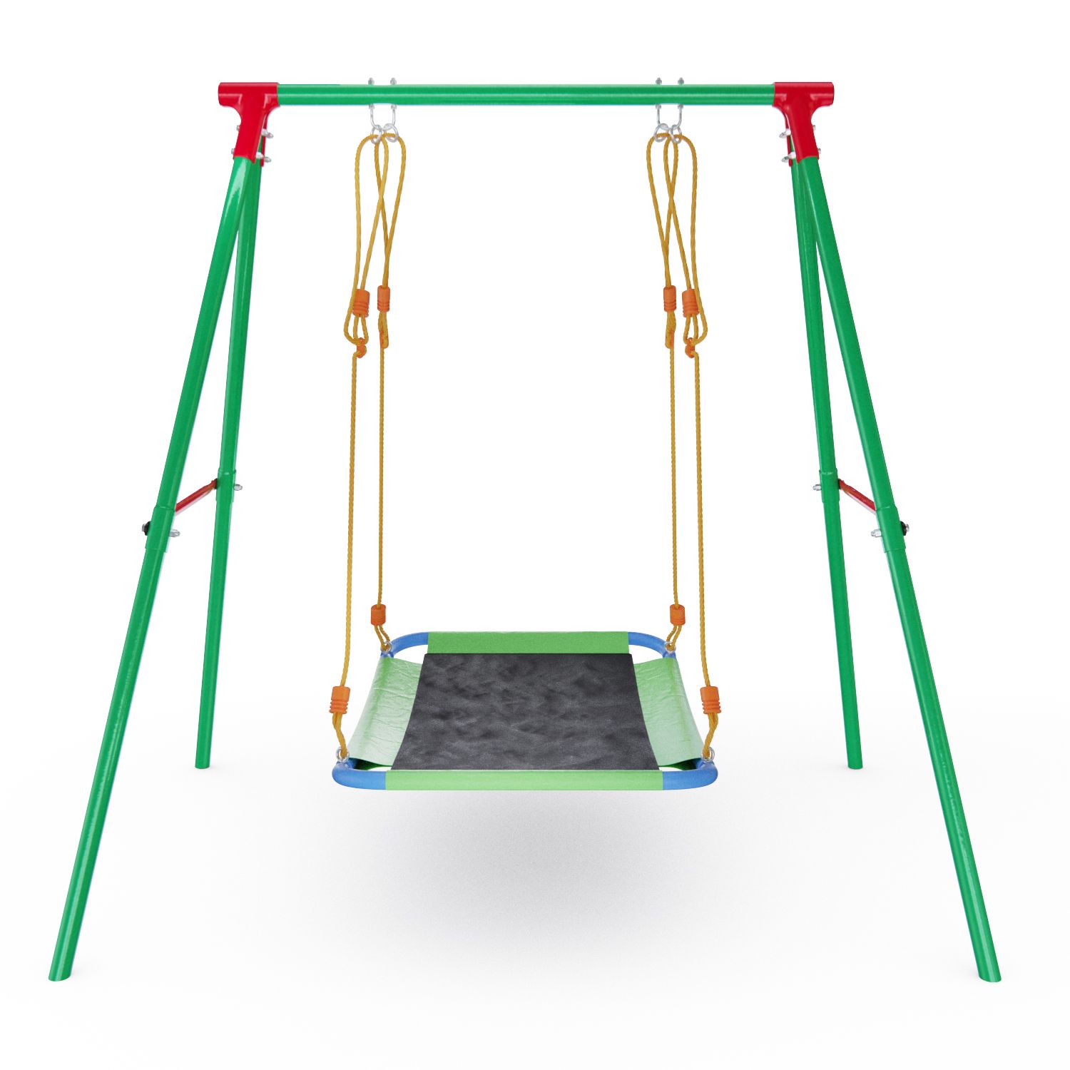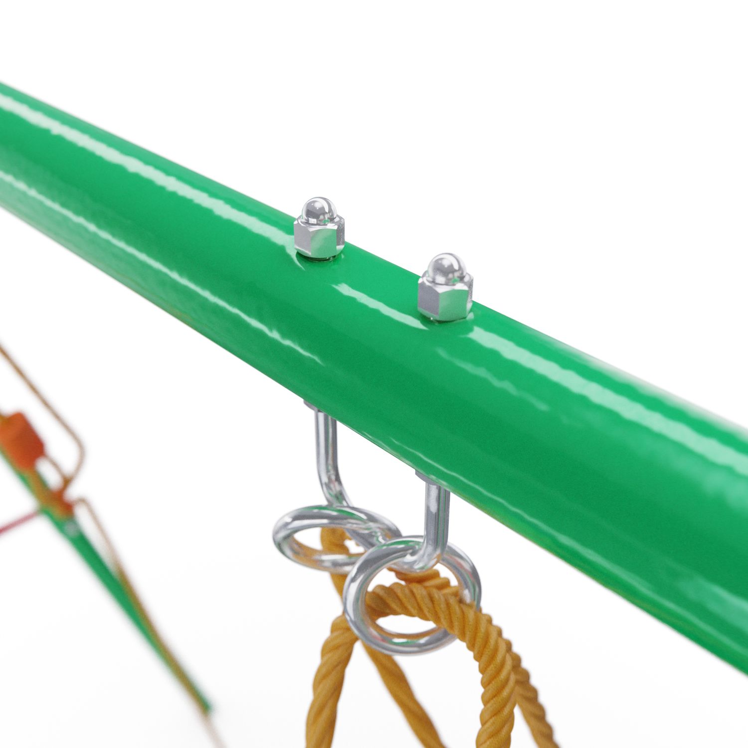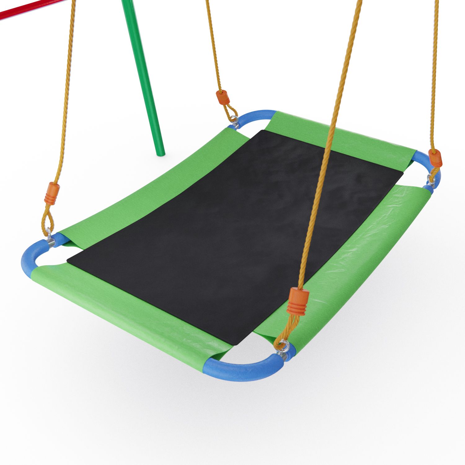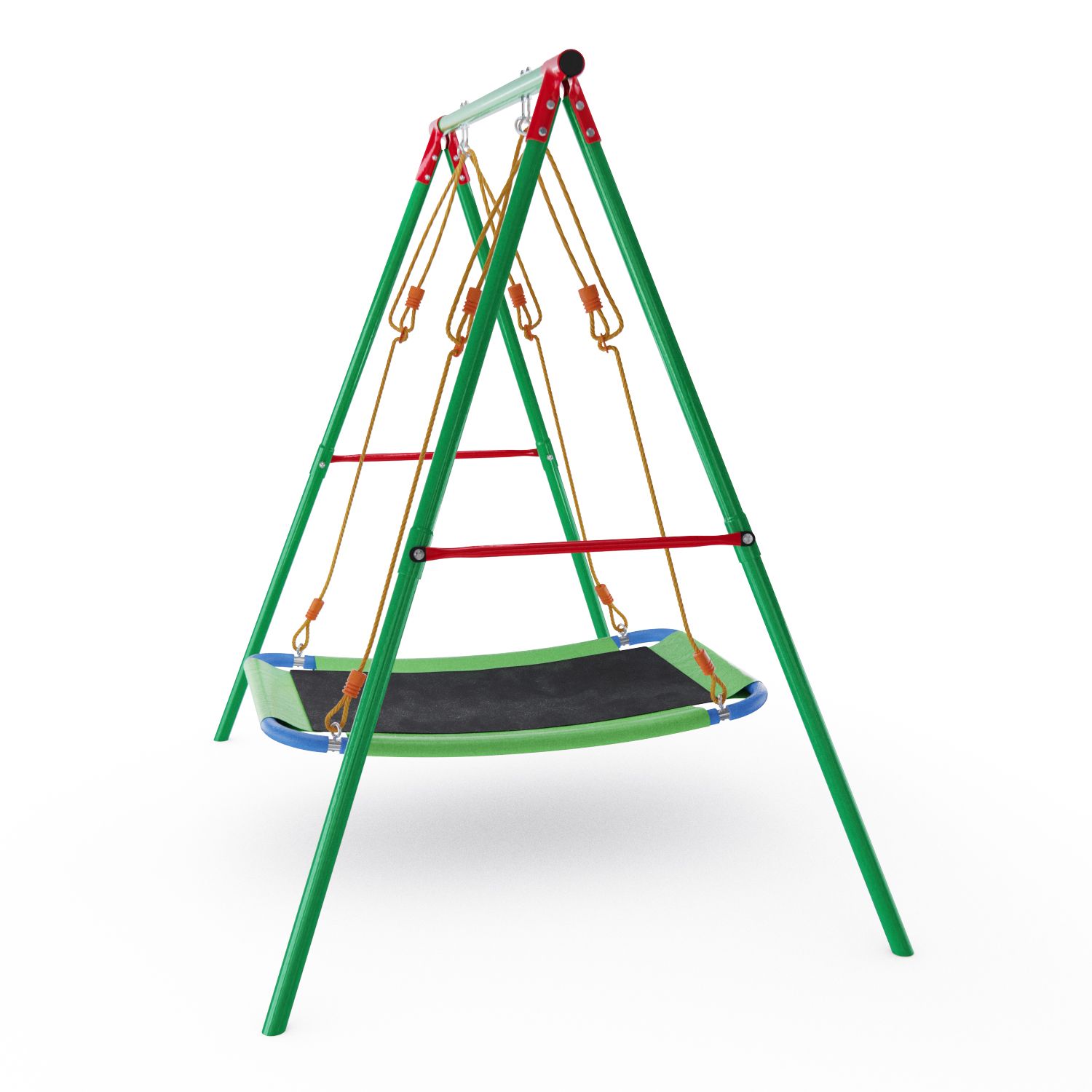 Многофункциональные качели-гамак SSN-02G серии DFC Kids — идеальный вариант для дачного участка. Они позволят ребенку не только весело провести время, но и комфортно отдохнуть на свежем воздухе. Размеры конструкции составляют 181×153×196 см плюс размах, поэтому устанавливать качели лучше на открытом месте участка. Сиденье выполнено в виде гамака, покрытого мягкой сеточкой, которое крепится к прочной металлической раме. Качели изготовлены из прочного металлического профиля (25,4 мм — боковые ребра, 45 мм — опоры, 50,8 мм — верхняя планка), устойчивого к нагрузкам; для рамы сиденья используется профиль 38,1 мм, покрытый кожухом из вспененного каучука. Совокупность этих факторов гарантирует безопасность конструкции, поэтому качели могут использоваться детьми от 3 лет. Максимальная нагрузка 35 кг.  Под каждый анкер выкопайте яму глубиной 40 см и залейте бетонным раствором 30x30x50 см (ДxШxВ). Воткните анкеры в раствор, пока он не застыл.