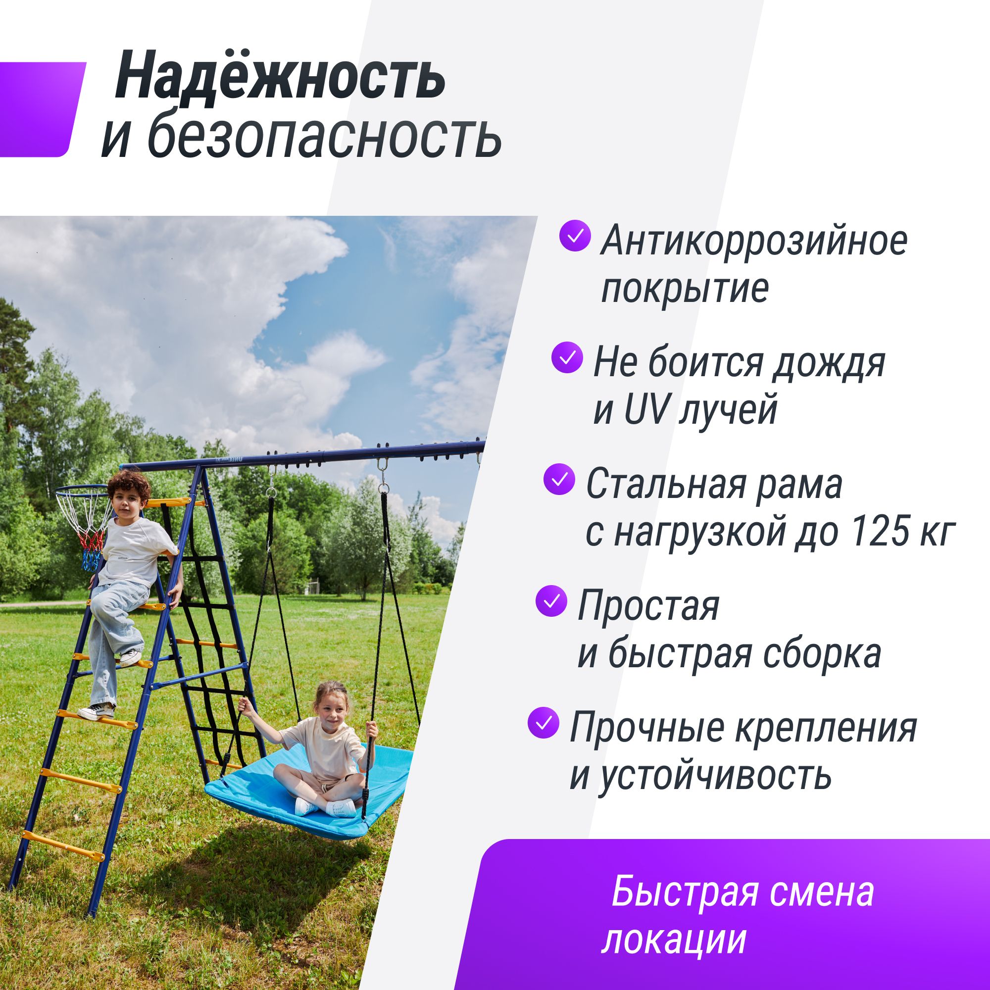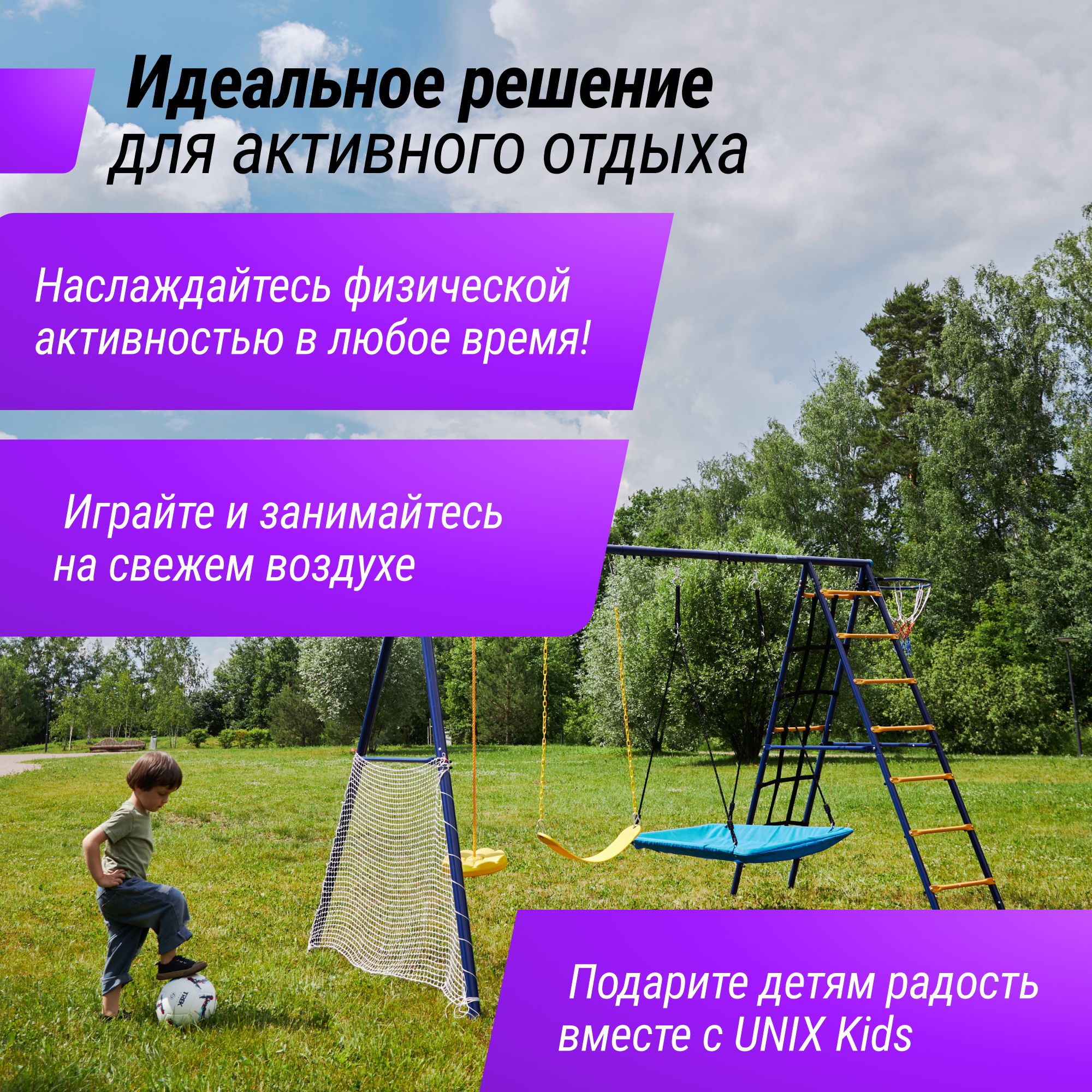 Игровой уличный комплекс с качелями и футбольными воротами UNIX Kids станет сердцем вашего двора и любимым местом для развлечений! Детский комплекс сочетает в себе безопасность, качество и уникальный дизайн, чтобы обеспечить детям максимум удовольствия и активности на свежем воздухе. Каждая деталь комплекса продумана до мелочей, чтобы обеспечить безопасность и комфорт детям разного возраста. С разными качелями, лазалками, футбольными воротами и баскетбольным кольцом, дети смогут не только развиваться физически, но и проводить время с пользой, развивая координацию движений, силу и ловкость. Кроме того, детский игровой комплекс способствует социализации, помогая детям научиться работать в команде и развивать навыки общения. Создайте уникальное игровое пространство прямо у себя дома с уличным игровым комплексом с качелями и футбольными воротами и подарите своим детям яркие впечатления, веселые приключения и радость. Позвольте им погрузиться в мир фантазии и игры, где каждый день наполнен новыми открытиями и эмоциями! Спортивно игровой комплекс для улицы от UNIX Kids - это уголок счастья и радости для малышей и детей постарше!
