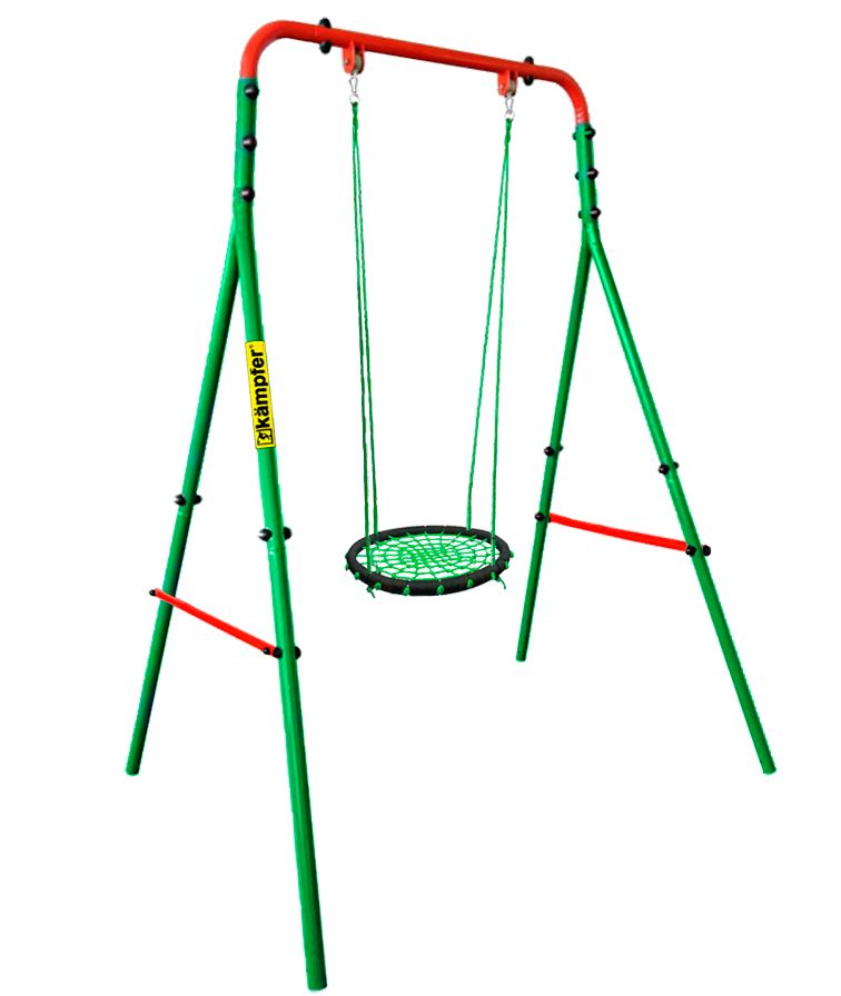 Конструкция Kampfer Wippe представляет собой две А-образных опоры из 2-х металлических стоек, соединенных между собой перекладиной для навесного оборудования - с креплениями для качелей "гнездо". Дети с удовольствием играют на этом детском спортивном уголке часами, при этом укрепляются мышцы, развивается ловкость и физическое здоровье малышей.