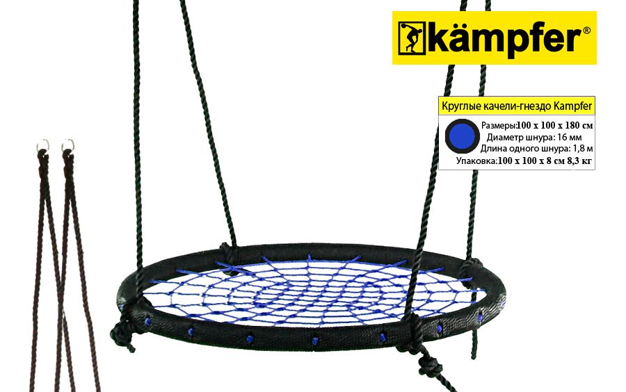 Качели-гнездо Kampfer выполнены из металлической рамы диаметром 100 сантиметров, с дополнительной защитной оплеткой ее бортиков, обтянутых прочным синтетическим канатом выдерживающим нагрузку 100 кг. Плетеное синтетическое сидение качелей удобное и практичное, не собирает