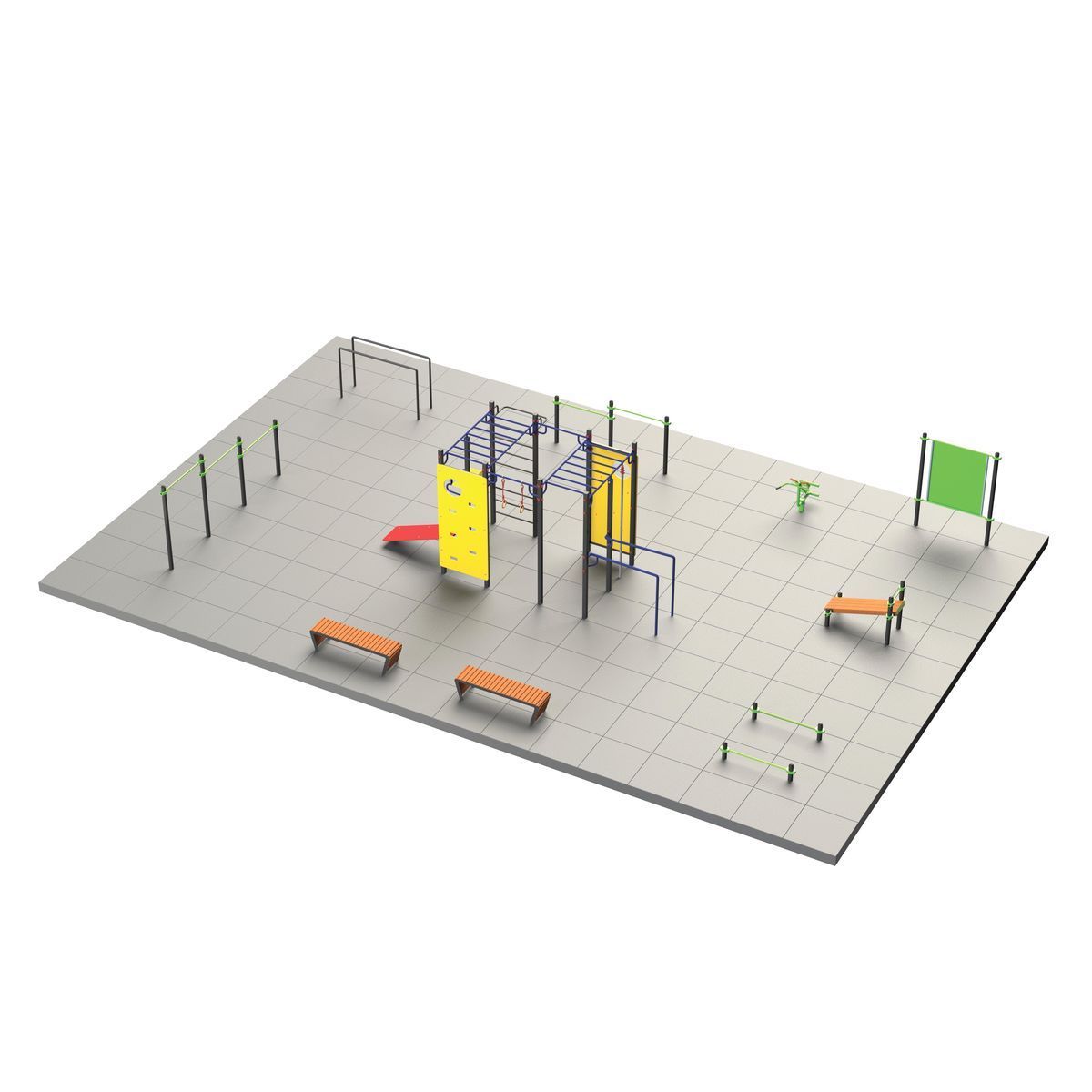Детская спортивная площадка, включающая шведскую стенку, брусья, рукоходы, лазательные конструкции, канат и кольца, а также скамью.