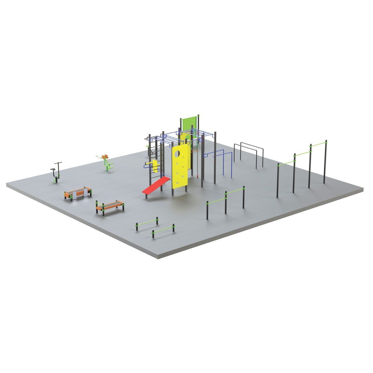 Детская спортивная площадка, включающая шведскую стенку, брусья, рукоходы, лазательные конструкции, канат и кольца, а также скамью.