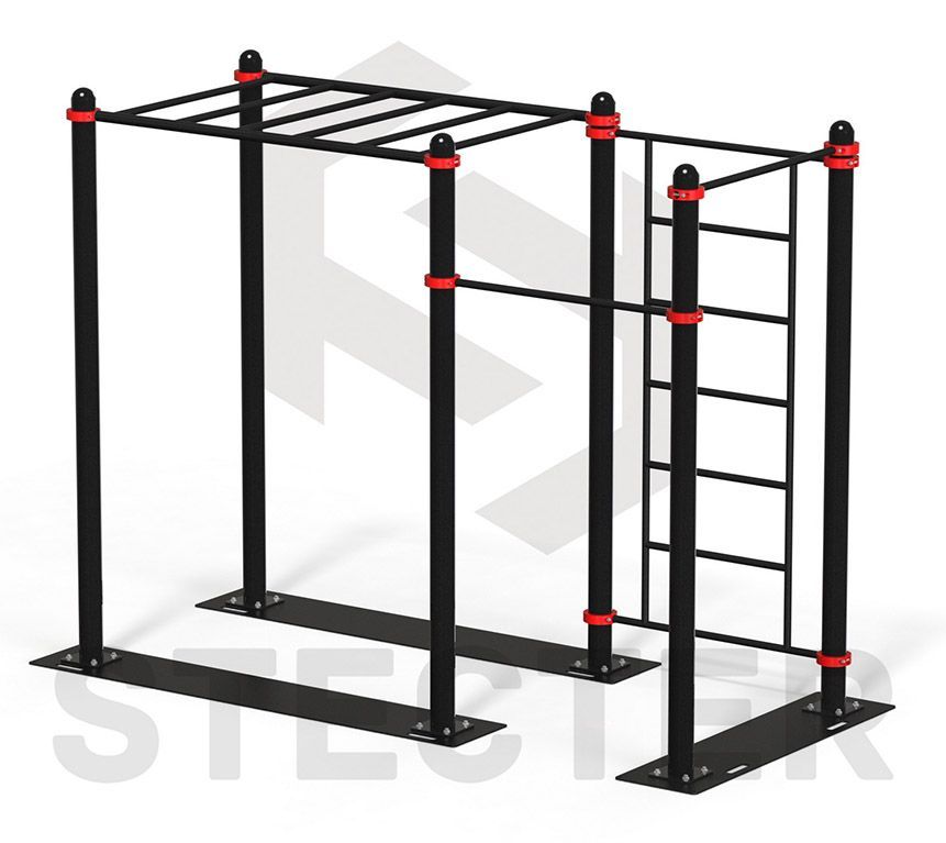 Спортивный комплекс представляет собой сборную металлическую конструкцию состоящую из шести опорных столбов с площадками для крепления к пластинам основания и полусферическими заглушками, двух перекладин длиной L=1090 мм., а так же рукохода и шведской стенки. Крепление элементов спортивного комплекса осуществляется хомутами, что позволяет легко и быстро фиксировать их на нужной высоте, а опорных столбов к пластинам основания болтами с полусферической головкой. Разборная конструкция спортивного комплекса имеет высокую прочность и позволяет без особых навыков производить её монтаж и демонтаж. Все элементы покрыты атмосферостойкой порошковой краской, нанесенной методом электростатического напыления с последующим обжигом в печи.