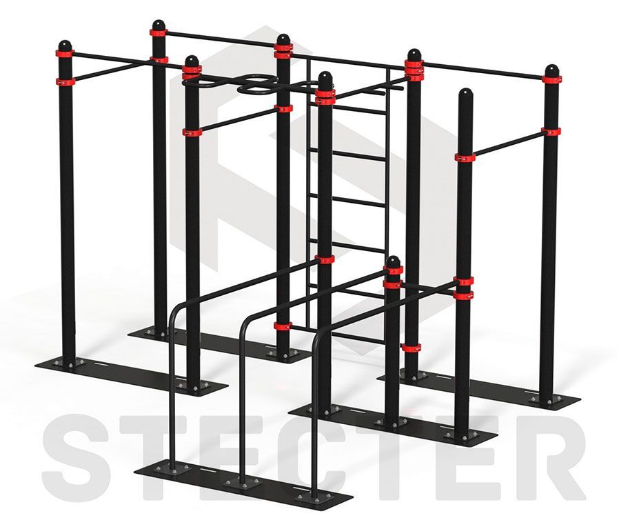 Спортивный комплекс представляет собой сборную металлическую конструкцию состоящую из девяти опорных столбов с площадками для крепления к пластинам основания и полусферическими заглушками, шести перекладин длиной L=1090 мм., одной перекладины длиной L=1090 мм с возможностью с возможностью выполнять упражнения «узким хватом», рукохода «змейка», брусьев для отжиманий и шведской стенки. Для большей жесткости опорные столбы брусьев усилены дополнительным поручнем длиной L=490 мм. Крепление элементов спортивного комплекса осуществляется хомутами, что позволяет легко и быстро фиксировать их на нужной высоте, а опорных столбов к пластинам основания болтами с полусферической головкой. Разборная конструкция спортивного комплекса имеет высокую прочность и позволяет без особых навыков производить её монтаж и демонтаж. Все элементы покрыты атмосферостойкой порошковой краской, нанесенной методом электростатического напыления с последующим обжигом в печи.