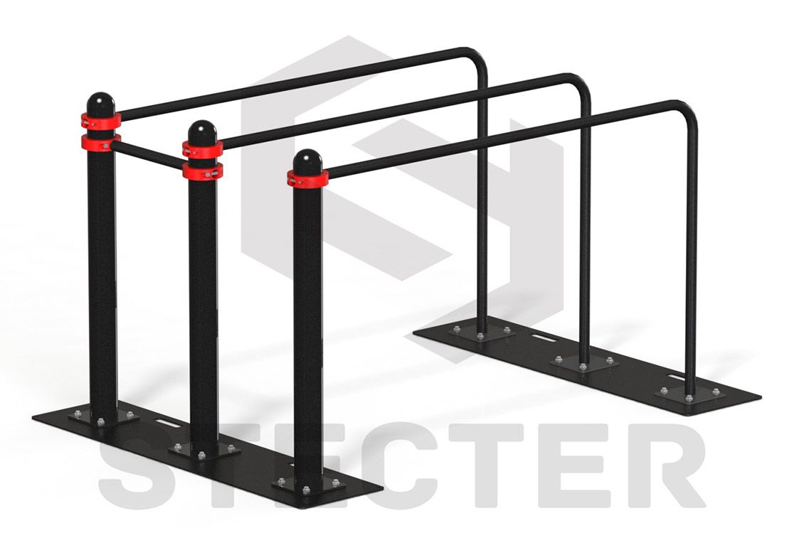 Спортивный комплекс представляет собой сборную металлическую конструкцию состоящую из трех опорных столбов с площадками для крепления к пластинам основания и полусферическими заглушками, трех изогнутых поручней брусьев длиной L=1840 мм (диаметр поручня 42 мм) установленных на расстоянии друг от друга 600 мм и высотой 1090 мм. Между опорными столбами для большей жесткости установлен дополнительный поручень длинной 490 мм. Крепление элементов спортивного комплекса осуществляется хомутами, а опорные столбы закрепляются болтами с полусферической головкой. Разборная конструкция спортивного комплекса имеет высокую прочность и позволяет без особых навыков производить её монтаж и демонтаж. Все элементы покрыты атмосферостойкой порошковой краской, нанесенной методом электростатического напыления с последующим обжигом в печи.