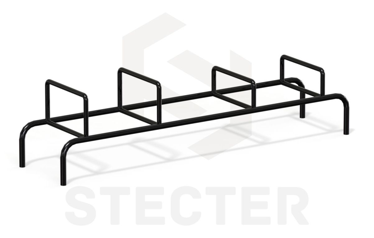 Монтаж стальной конструкции, изготавливаемой из труб, прошедших антикоррозийную обработку, осуществляется бетонированием на глубину 50 сантиметров. Длина изделия составляет 2400 миллиметров, высота – 600 мм. Диаметр стальных труб – 34 и 42 миллиметра. Лавка с упорами – это сварная металлическая конструкция, обладающая высокой прочностью.