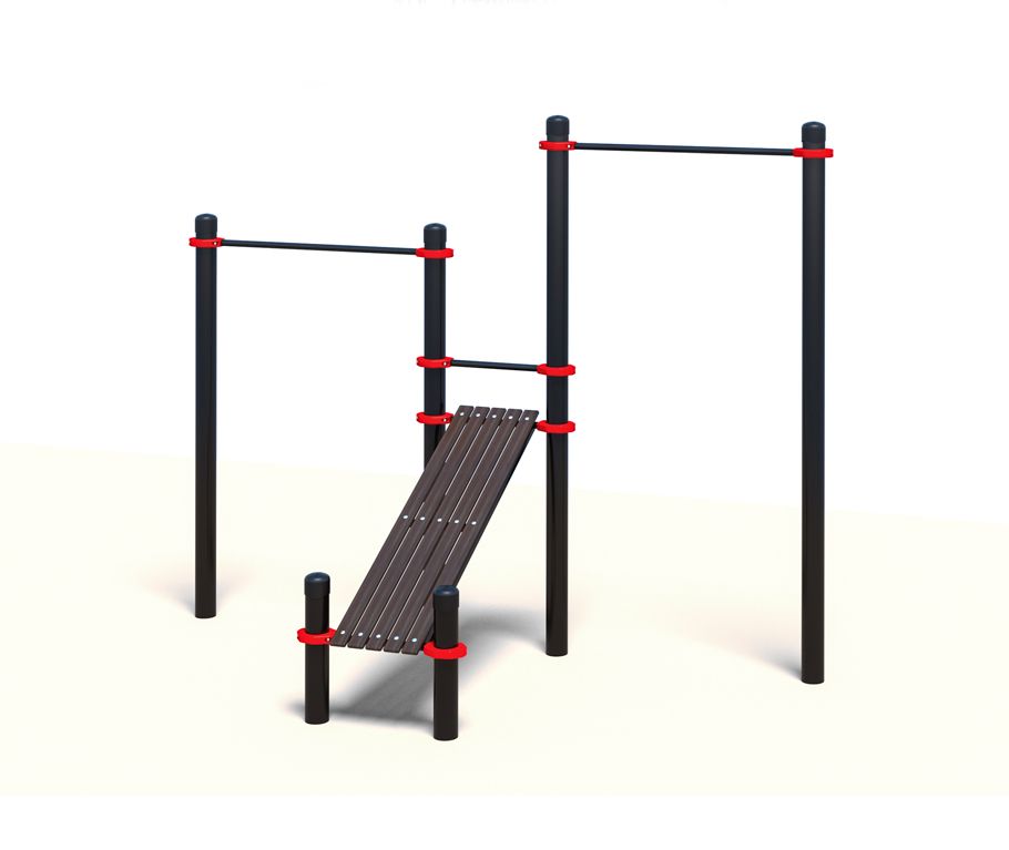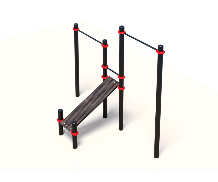 Компактный спортивный комплекс, который включает в себя 2 перекладины для подтягиваний, длина которых составляет 1200 миллиметров, а также лавка для пресса с уклоном. Последнюю можно отрегулировать по высоте установки, обеспечивая необходимый угол наклона.