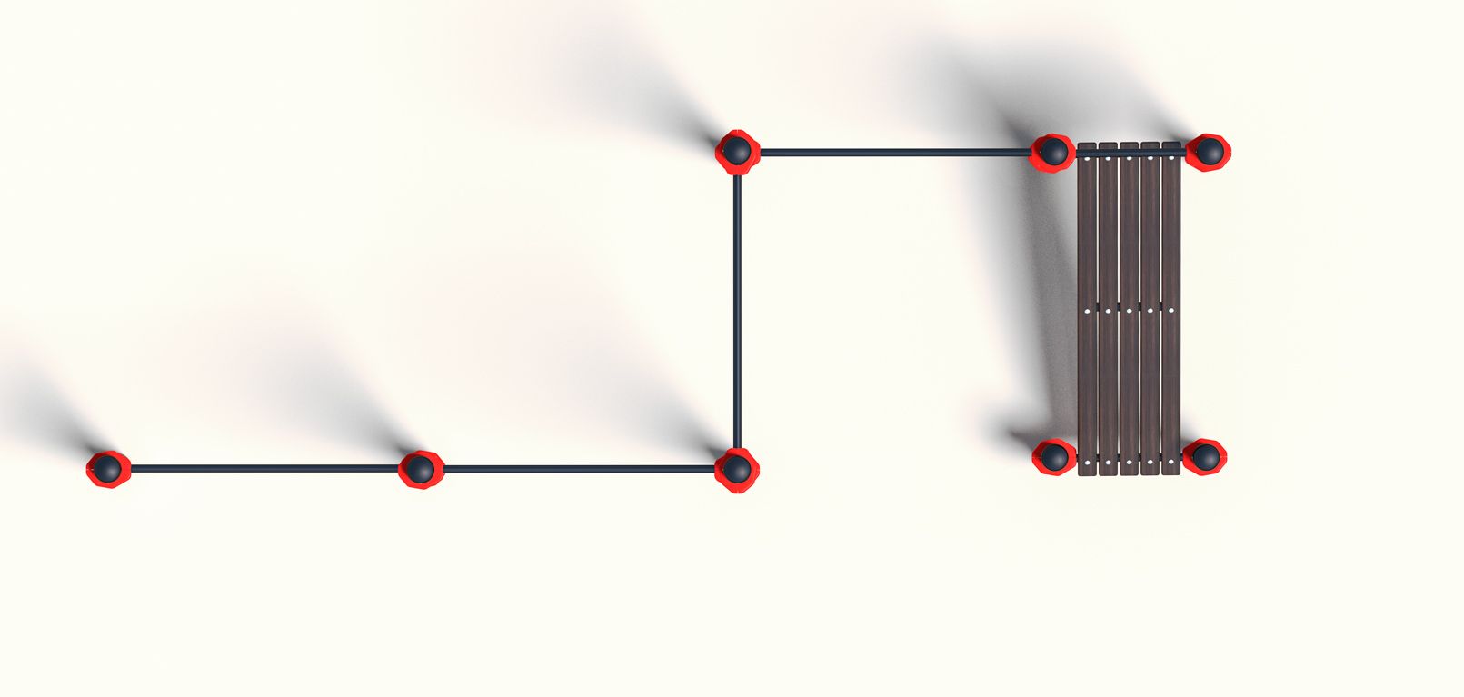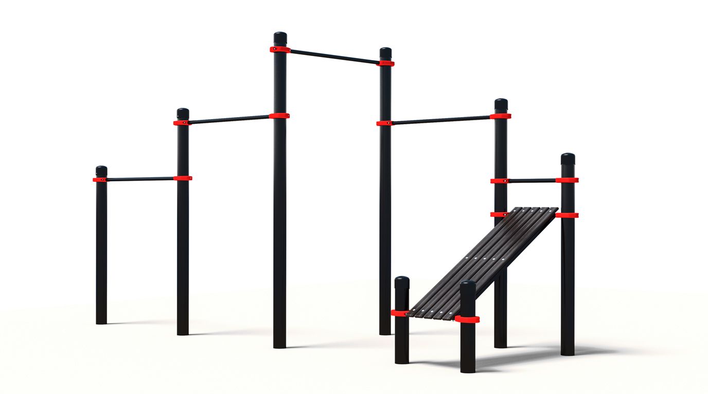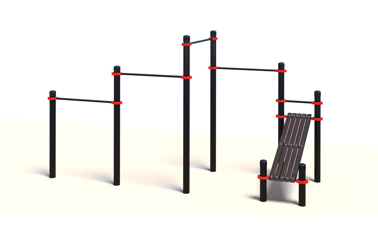 Компактный спортивный комплекс, который включает в себя 4 перекладины для подтягиваний, длина которых составляет 1200 миллиметров, а также одной лавочки для пресса. Последнюю можно регулировать по высоте во время монтажа, обеспечивая необходимый угол наклона.
