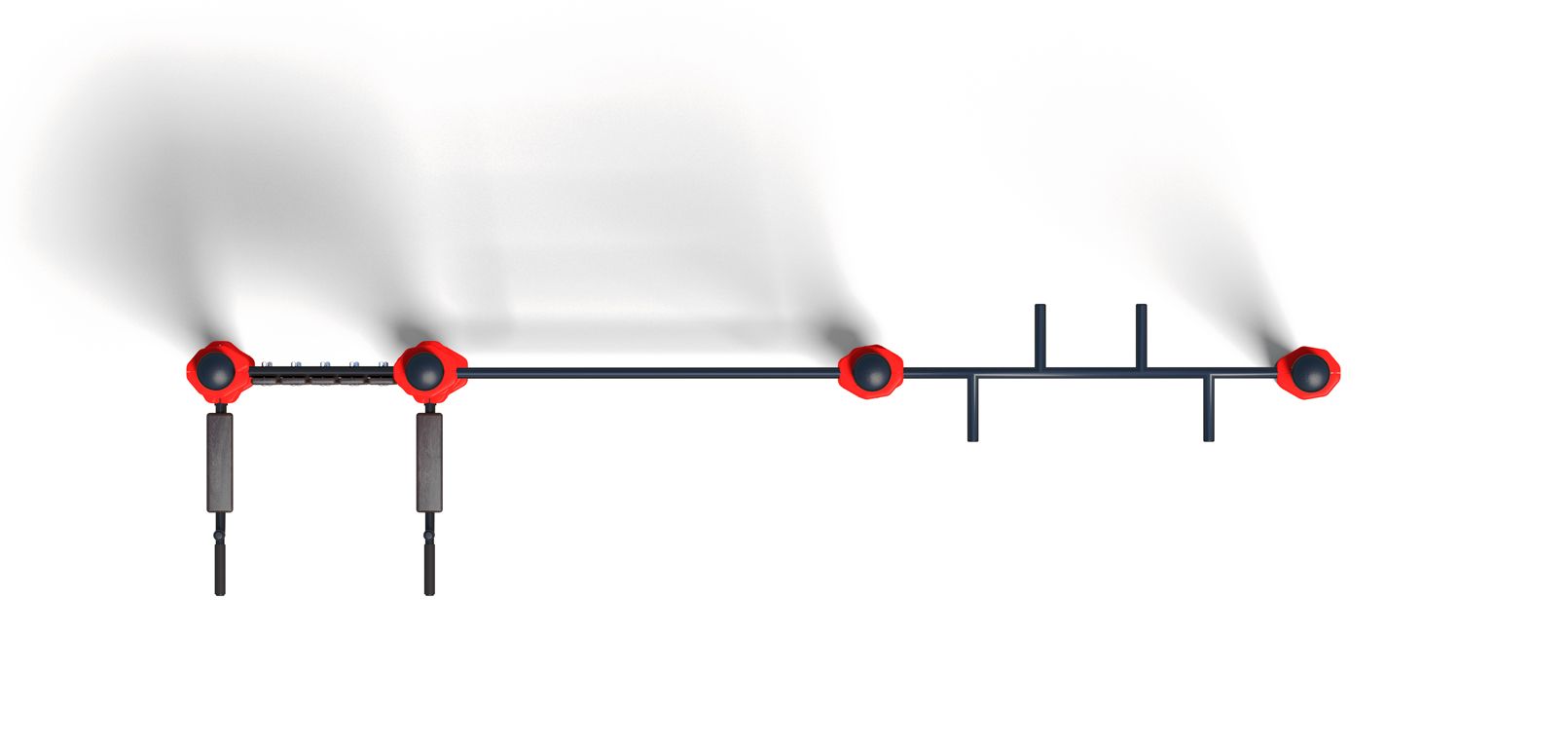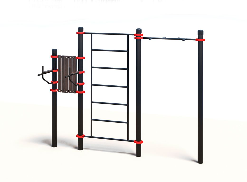 Комплекс включает в себя все основные снаряды для занятий уличным фитнесом – воркаутом. В его состав входит четыре опорных столба (круглые стальные трубы с толстыми стенками) высотой от 2000мм до 2600 мм, к которым посредством металлических хомутов прикрепляются такие элементы: