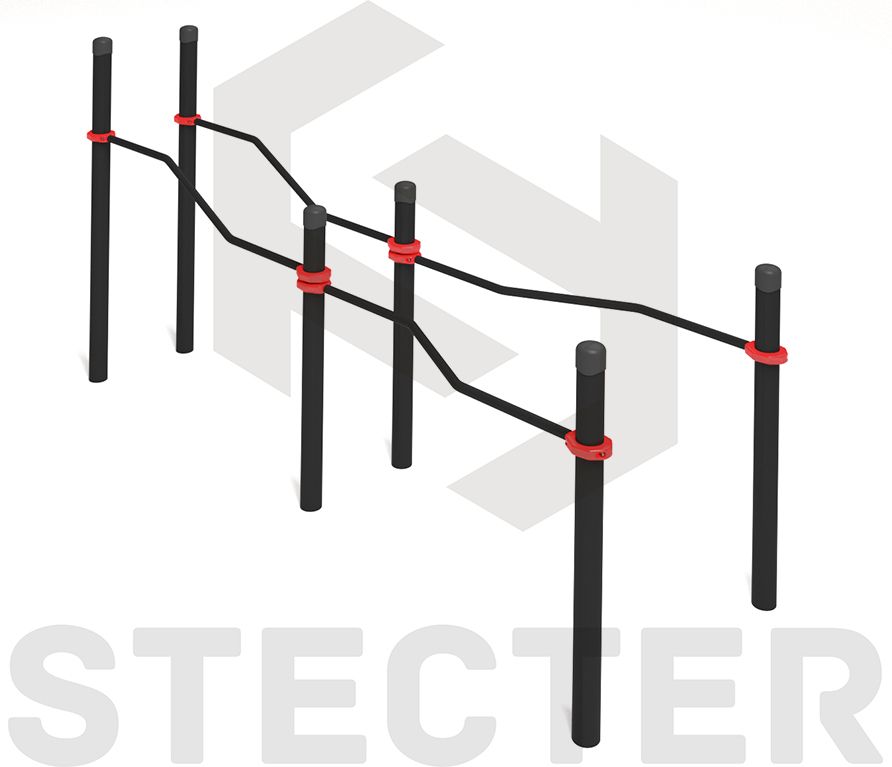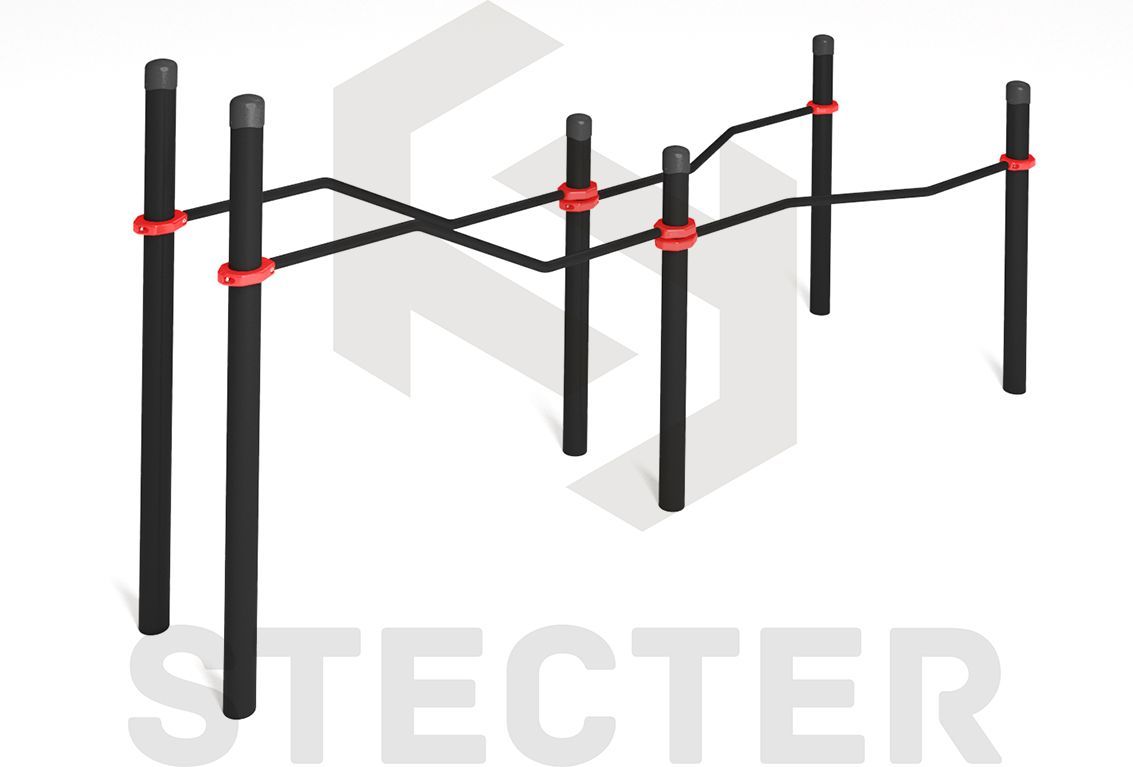 Комплекс состоит из шести опорных столбов высотой: 2 шт. - 1530 мм, 4 шт. - 1200 мм и четырех зигзагообразно изогнутых жердей длиной 1790 мм. Расстояние между центрами опорных столбов брусьев 608 мм - с одной стороны и 1008 мм - с другой стороны. Жерди крепятся к опорным столбам при помощи хомутов на высоте: 1200 мм в верхней части и 1000 мм в нижней части от поверхности основания. Длина комплекса не более 4200 мм.