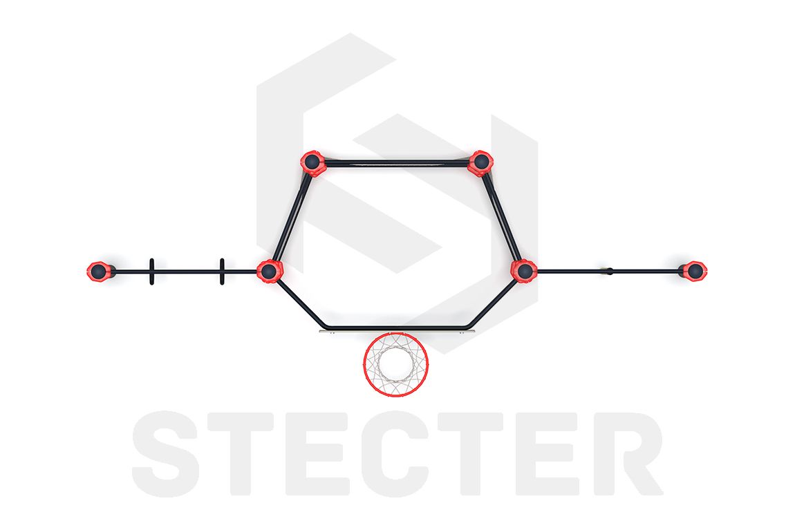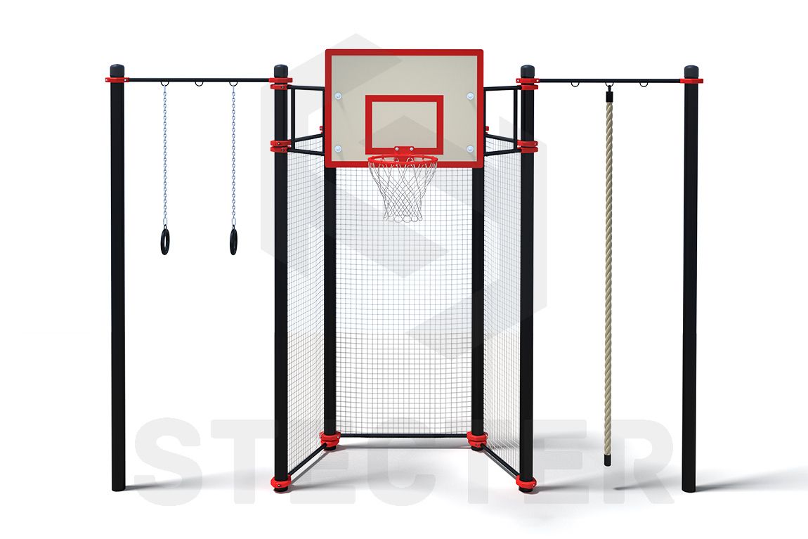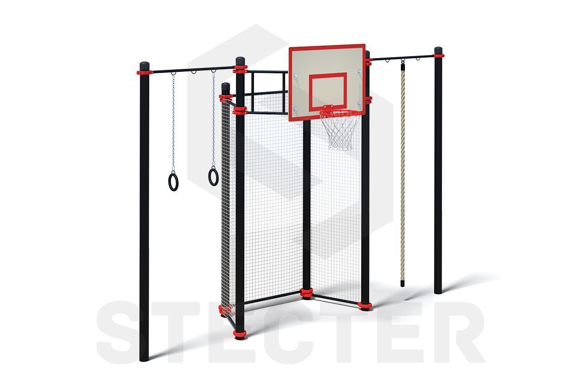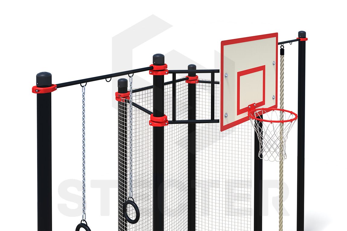 Уличный спортивный комплекс состоит из шести опорных столбов, изготовленных из металлических труб, высотой от 2550мм до 3400мм. Столбы сверху закрыты пластиковыми заглушками.