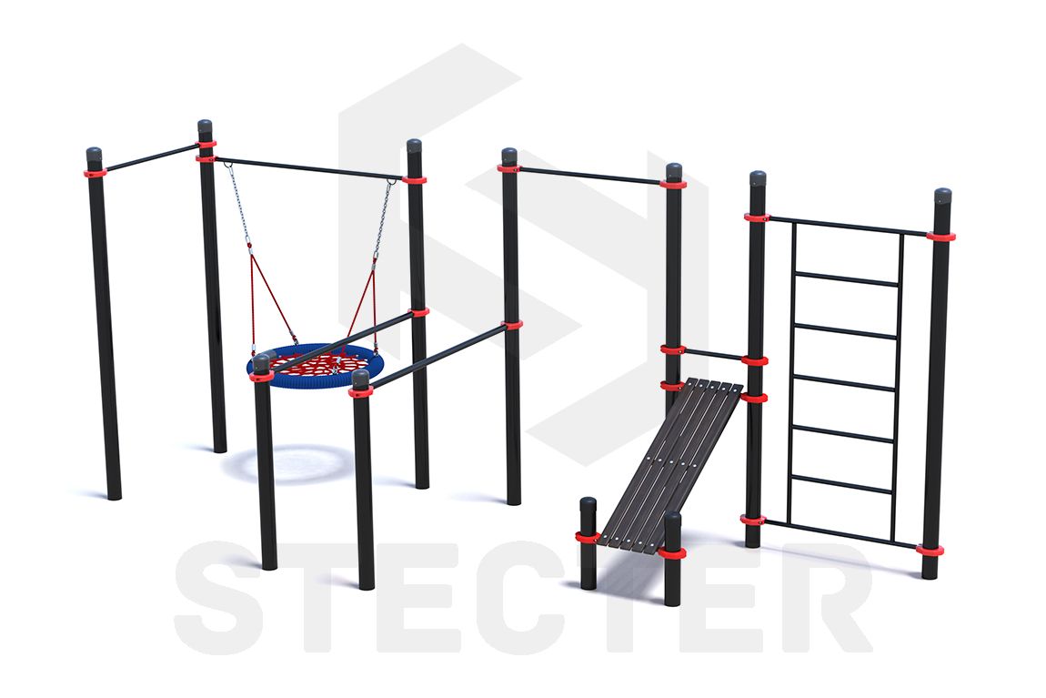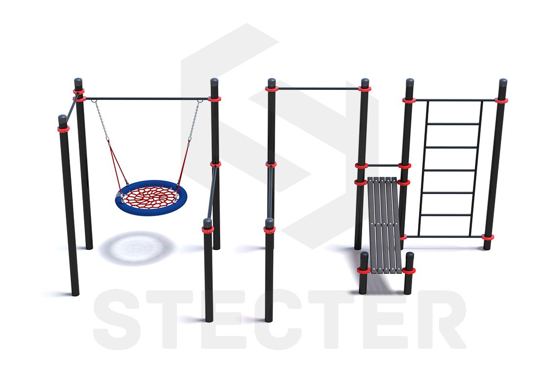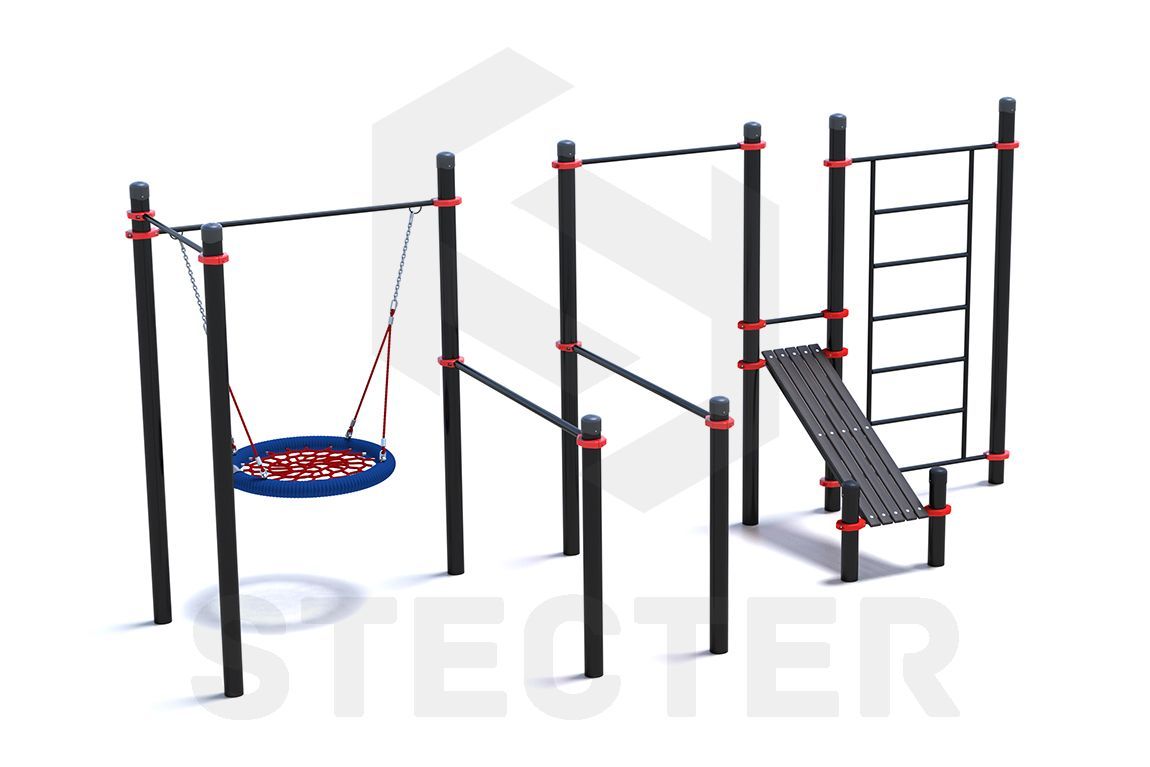 Уличный комплекс из двух турников, качели Гнездо, брусьев, наклонной скамьи и шведской стенки