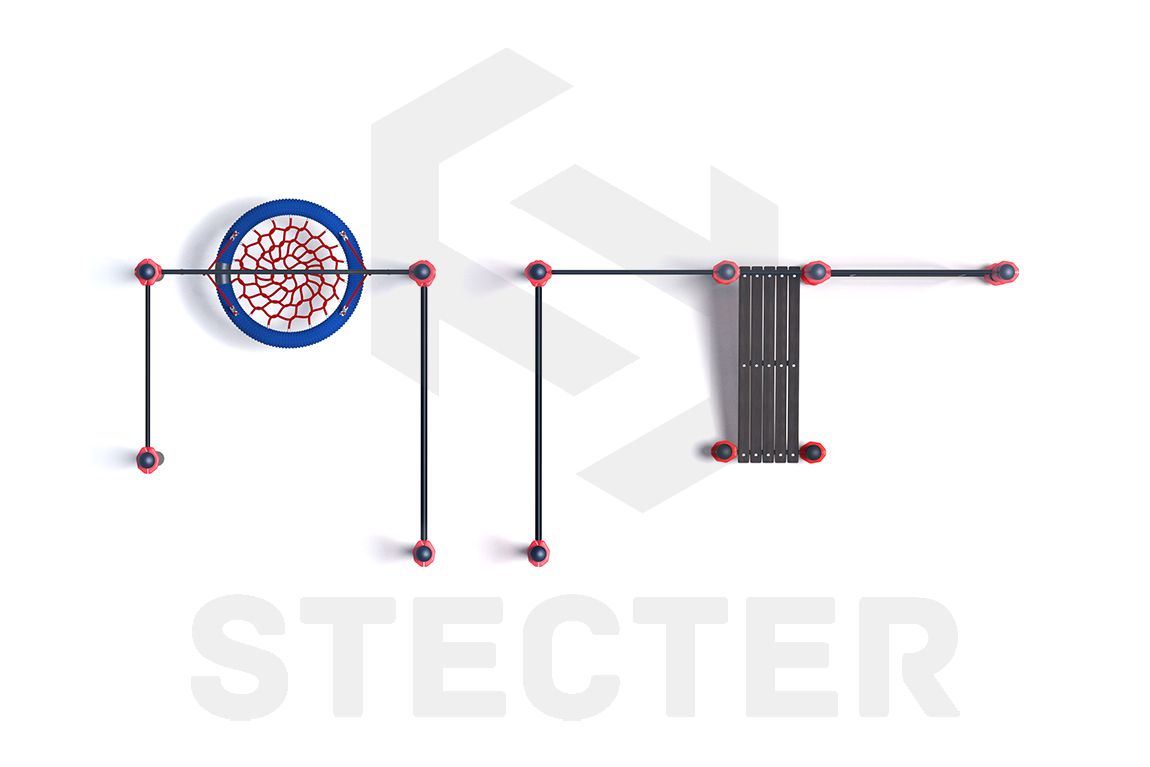 Уличный спортивный комплекс состоит из одиннадцати опорных столбов, изготовленных из металлических труб, высотой от 400мм до 2550мм. Столбы сверху закрыты пластиковыми заглушками.