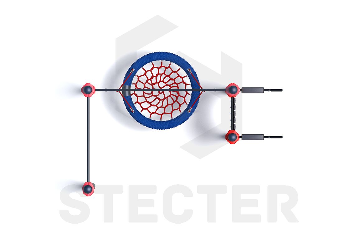Качели «гнездо» с утяжеленным ободом. Диаметр изделия — 1000 мм. Плетение внутри кольца выполнено из четырехпрядного армированного каната диаметром 16 мм. Диаметр обода после оплётки канатом составляет 90 мм. Качели комплектуются подвесами из шестипрядного армированного каната. Длина подвесов — 1340 мм. Качели рассчитаны на интенсивное использование, выдерживают нагрузку до 250 кг — подходят для игровых площадок в общественных местах (парках, скверах, придомовых территориях).
