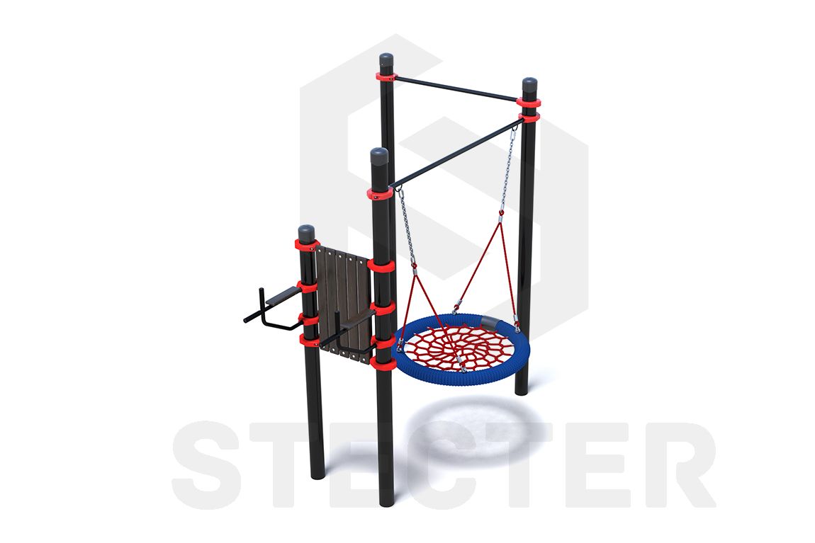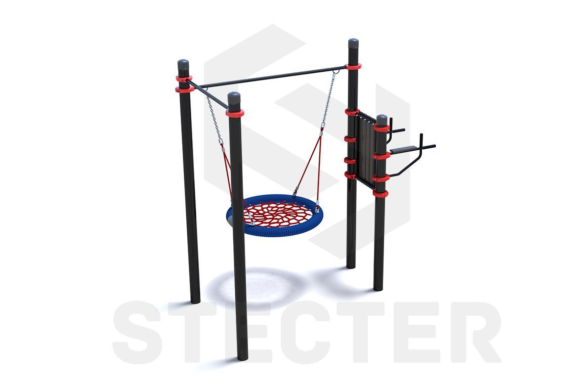 Уличный комплекс из турника, качели Гнездо и тренажера вертикальные брусья-пресс