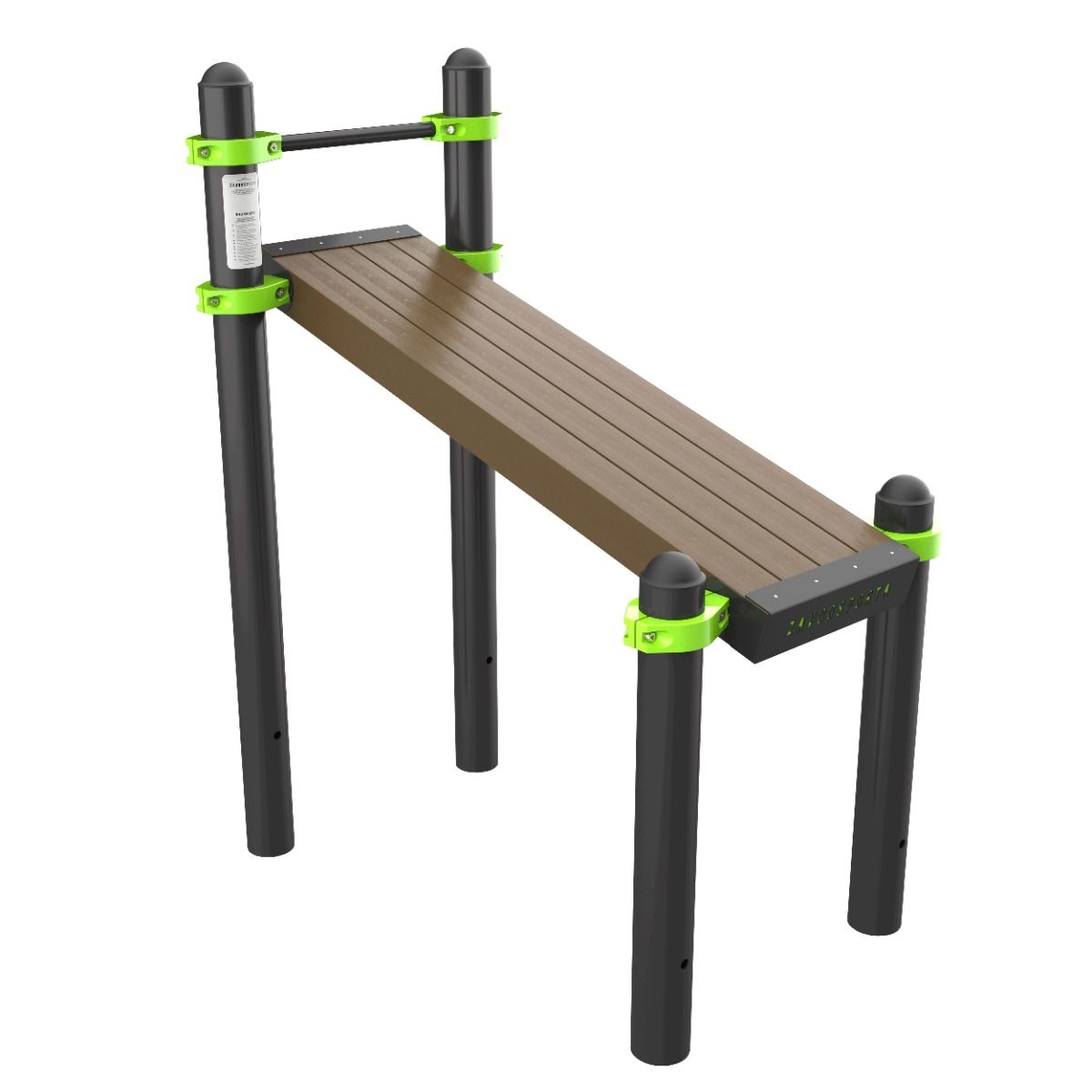 Основание скамьи выполнено из ДПК-бруса (древесно-полимерного композита). Материал устойчив к воздействию влаги, ультрафиолетового излучения и перепадам температур, не подвержен гниению, образованию грибка и поражению насекомыми, не требует покраски и дополнительного обслуживания, что обеспечивает длительный срок эксплуатации при круглогодичном использовании на открытом воздухе.