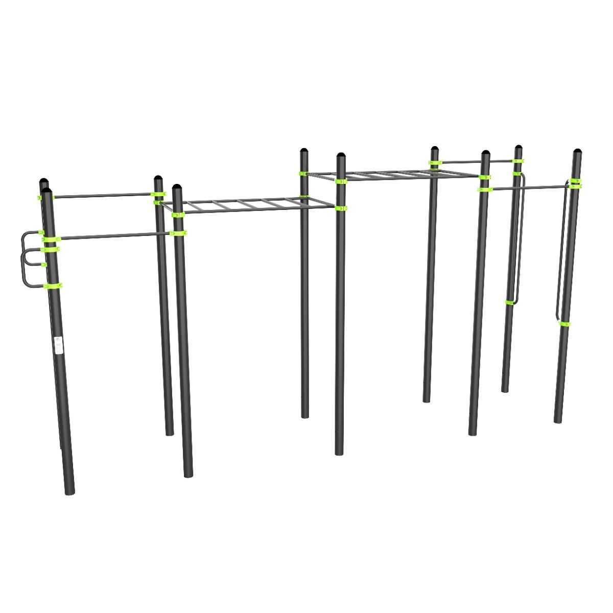 Перекладины классического горизонтального рукохода (по семь перекладин на каждом), вертикальные перекладины, короткие поручни и турники выполнены из металлической трубы диаметром 34 мм с толщиной стенки 3,2 мм.