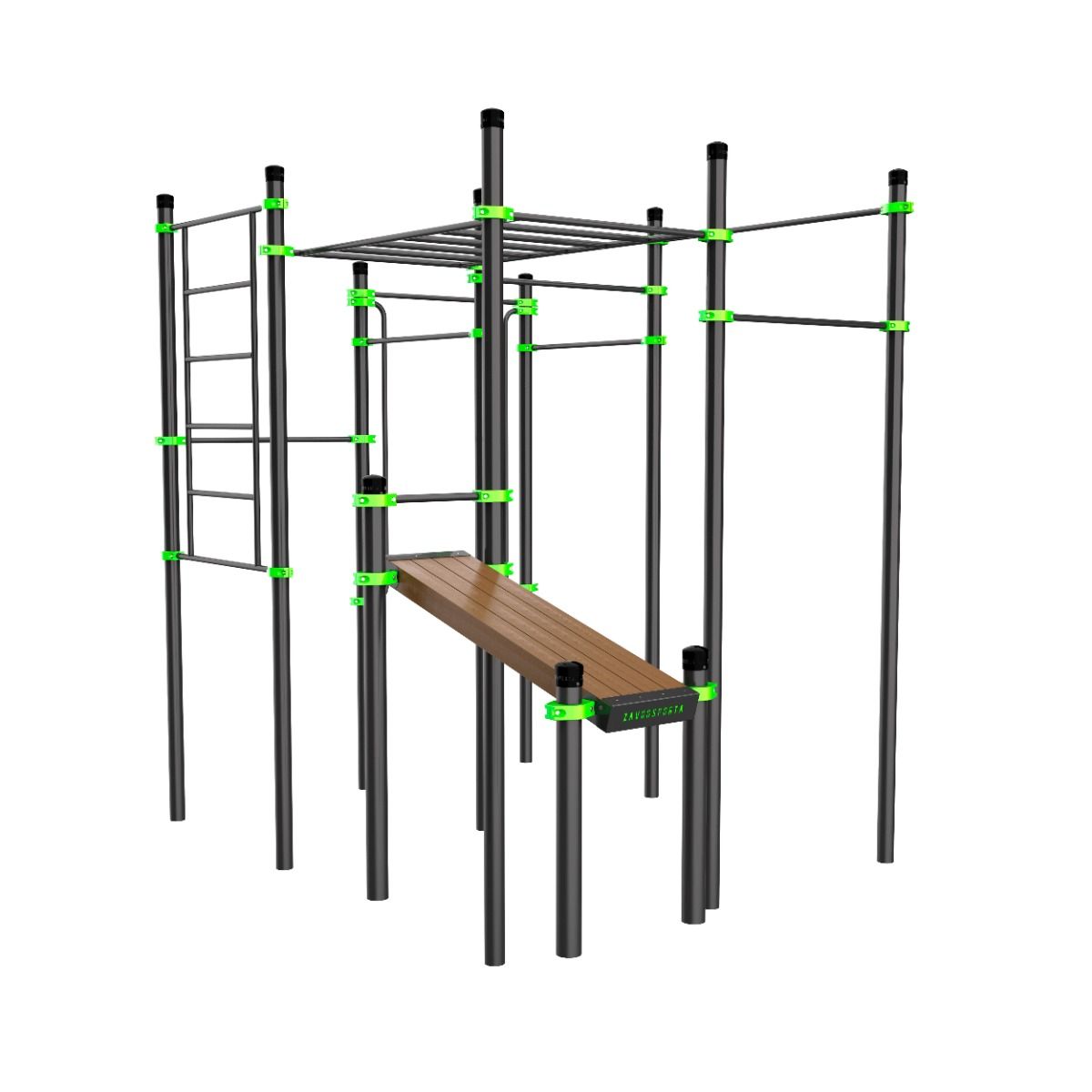 Перекладины шведской стенки, турников, перекладина-опора для ног на скамье, рукоход горизонтальный, перекладины вертикальные и прочие элементы выполнены из металлической трубы диаметром 34 мм с толщиной стенки 3,2 мм.