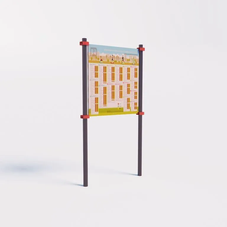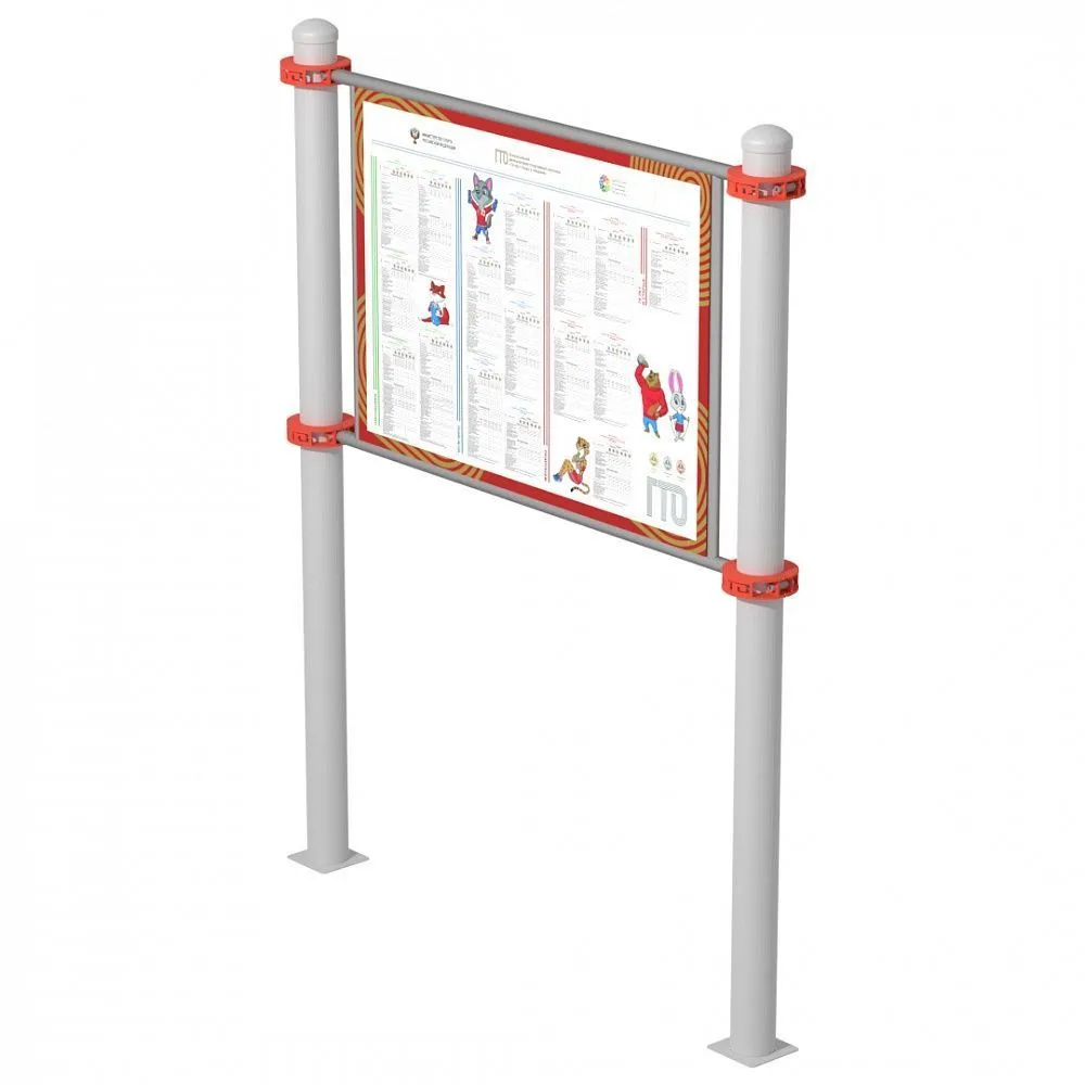 Разборная конструкция на основе двух опорных столбов диаметром 89 мм и закрепленном на них при помощи разъемных металлических хомутов информационного поля из металлического листа