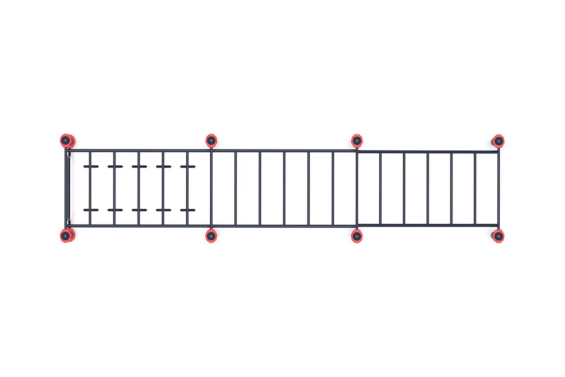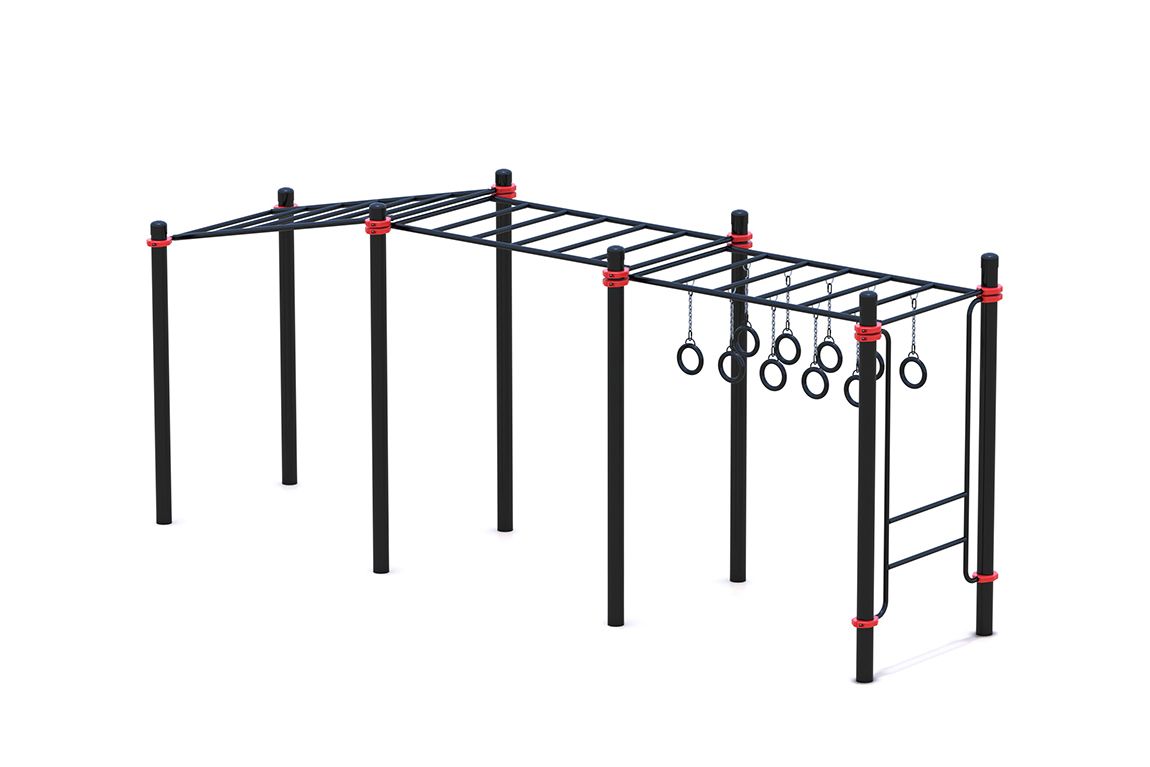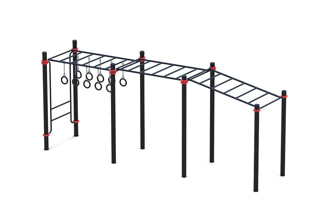 двух горизонтальных секций секций и одной наклонной. На крайней горизонтальной секции к перекладинам прикрепляются подвижные гимнастические кольца. Весь комплекс установлен на восьми вертикальных столбах с полусферическими заглушками. Занятия на рукоходах такого типа – это укрепление мышц рук, спины и брюшного пресса, а также отличная растяжка позвоночника, позволяющая избежать травм и не различных заболеваний.