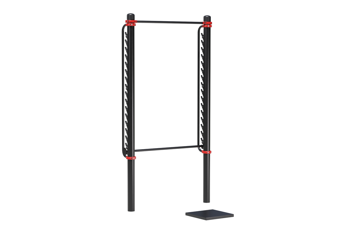 Спортивный комплекс Турник-перекладина с регулируемой высотой от 90 см до 260 см для выполнения испытаний «Подтягивание из виса на высокой перекладине» и «Подтягивание из виса лежа на низкой перекладине» с упором для ног для тестирования инвалидов и лиц с ограниченными возможностями здоровья состоит из двух вертикальных опорных столбов, изготовленных из металлических труб. На одной стороне столба размещена фигурная пластина с делениями, позволяющая установить турник-перекладину на желаемой высоте. Столбы сверху закрыты пластиковыми травмобезопасными заглушками. Горизонтальная турник-перекладина длиной 1289 мм устанавливается в желаемые деления для сдачи нормативов и может переставляться. К каждому столбу при помощи хомутов крепятся дугообразные ограничители, чтобы обеспечить перемещение турика только в заданном пространстве. Так же в комплекте поставляется упор для ног. Тренажер отвечает всем требованиям по сдаче норм ГТО!