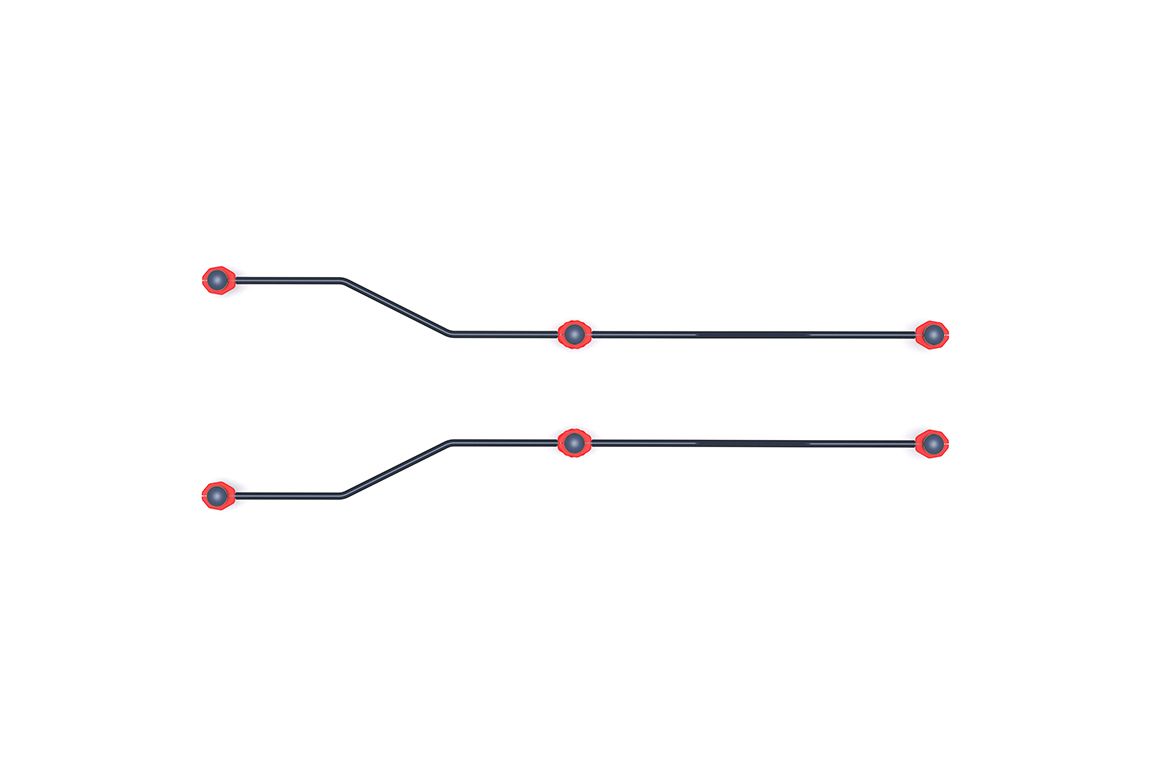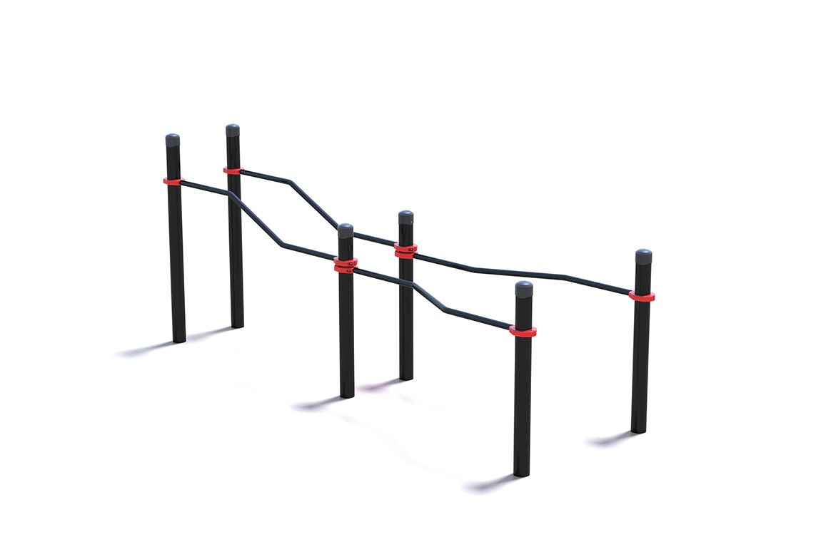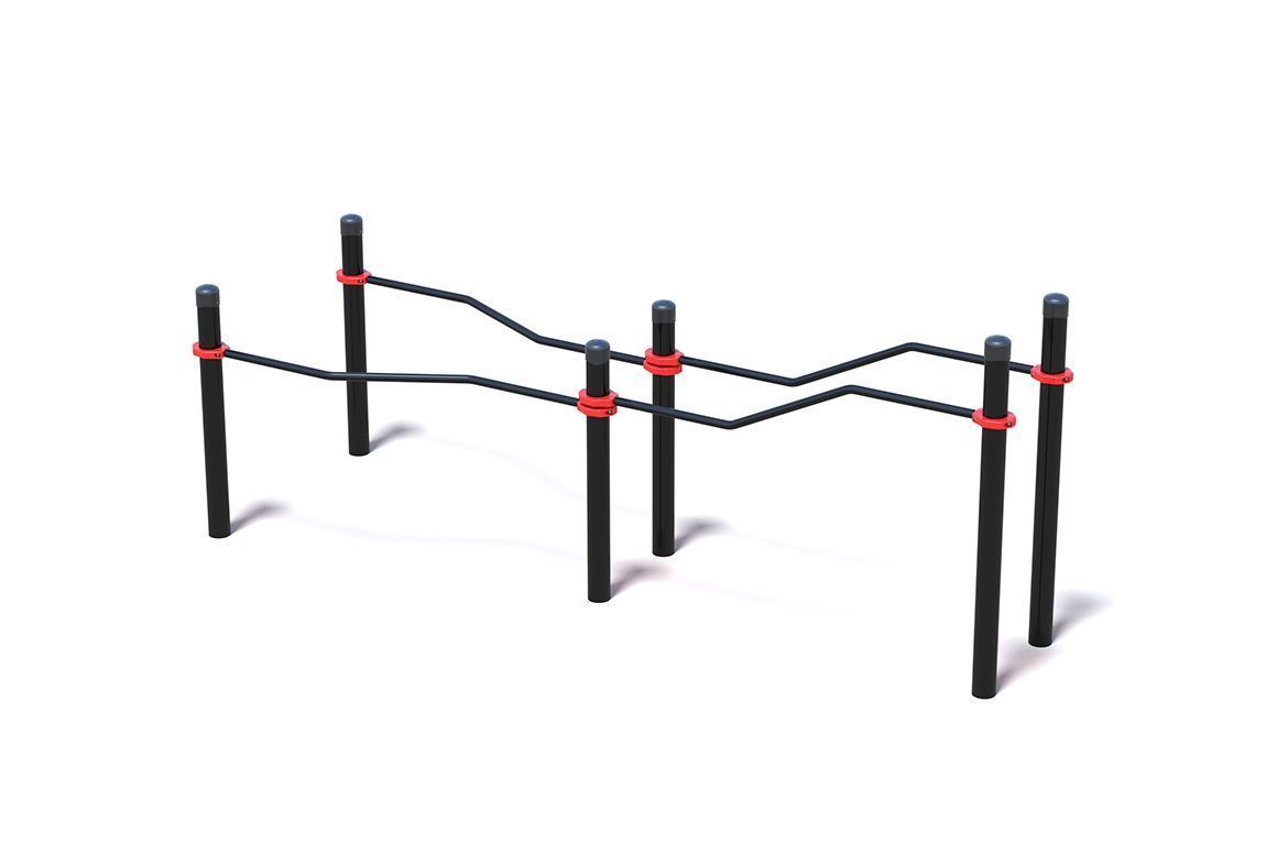 Комплекс "Брусья разноуровневые с возможностью занятий для инвалидов и лиц с ограниченными возможностями здоровья" состоит из шести опорных столбов и четырех зигзагообразно изогнутых поручней (жердей). Опорные столбы сверху имеют полусферические заглушки. Жерди крепятся к опорным столбам при помощи хомутов.