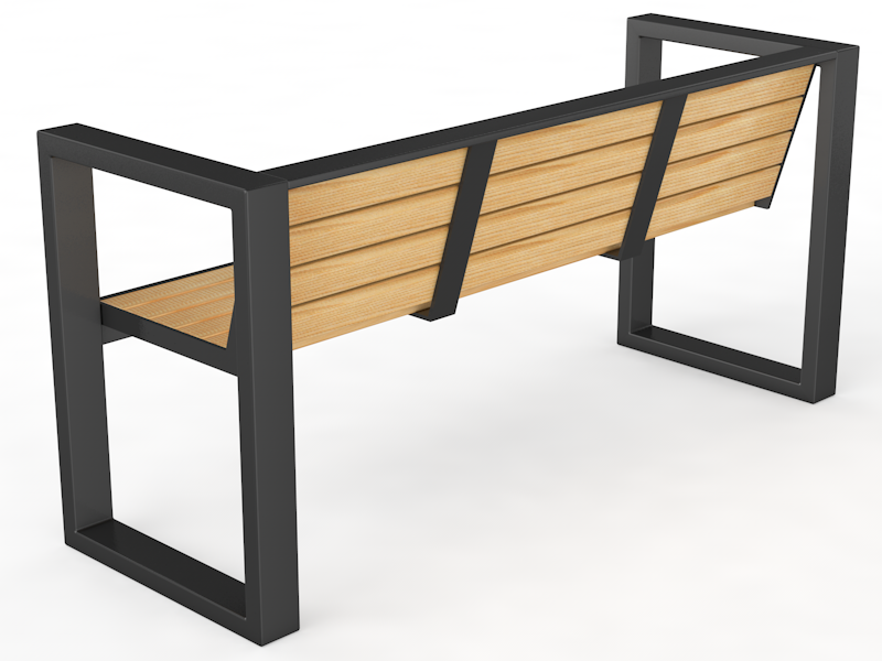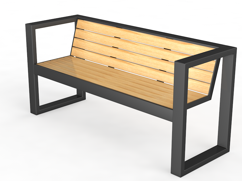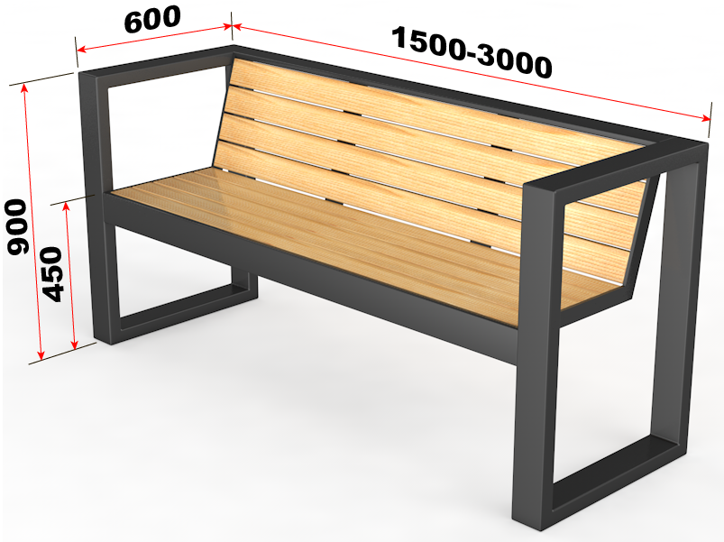 Каркас металлический, выполнен из профильной трубы 60х30х3 мм, покрашен порошковой краской. Настил деревянный, массив сосны, доски 100х40 мм, покрыты лаком. Торцы фрезерованы. Размеры скамьи варьируются от 1500 до 3000 мм.
