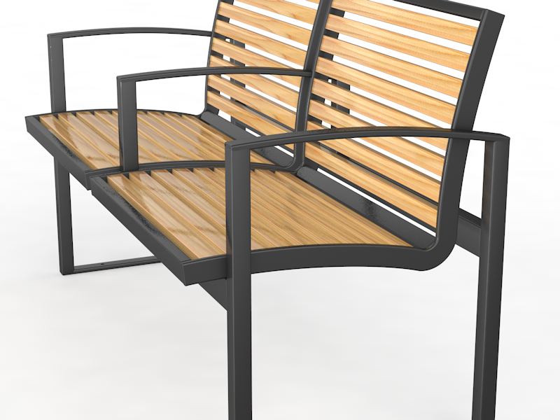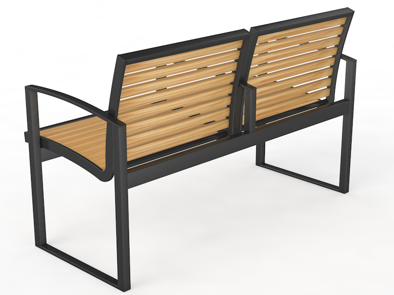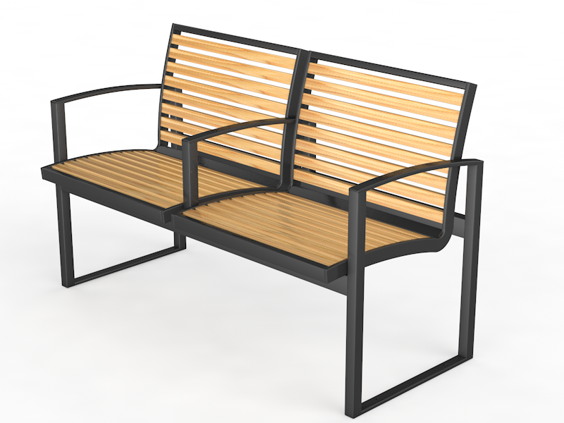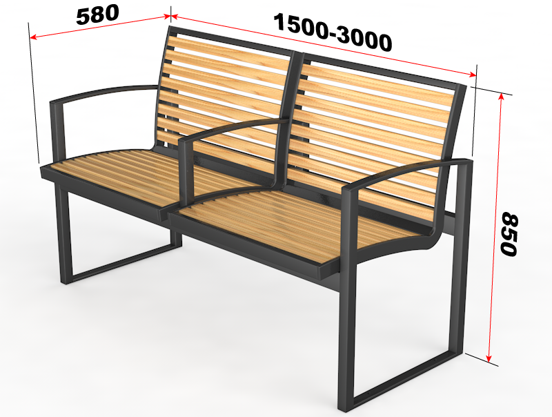 Каркас металлический, выполнен из профильной трубы 40х40х1,5 мм. Настил деревянный, массив сосны, доски 100х40 мм, покрыты лаком. Торцы фрезерованы. Размеры скамьи варьируются от 1500 до 3000 мм. Ножки бетонируются.