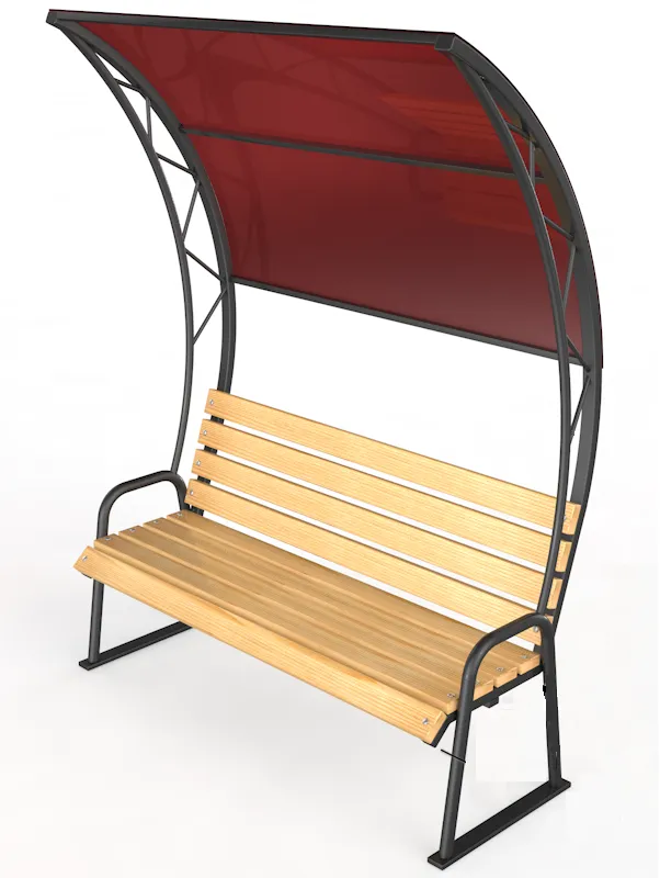 Скамейка изготовлена из профиля 40х20 мм, труб d=32 мм, а также гладкой арматуры АI - 10 мм. Общая высота скамьи с навесом 2090 мм, а до сиденья 440 мм. Металлокаркас окрашен порошковой краской. Навес выполнен из сотового поликарбоната толщиной 10 мм. Настил деревянный, массив сосны, доски 100х30 мм, покрыты лаком. Торцы фрезерованы. Представленный вариант имеет длину 1500 мм, но есть возможность изготовить длиной до 3000 мм, с шагом 500 мм.
